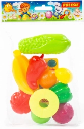Zestaw zawiera łącznie 10 sztuk, w tym kukurydzę o długości 8,5 cm. Elementy są lekkie, łatwe do trzymania w dłoni i nadają się do wielokrotnej zabawy w domu i w przedszkolu.