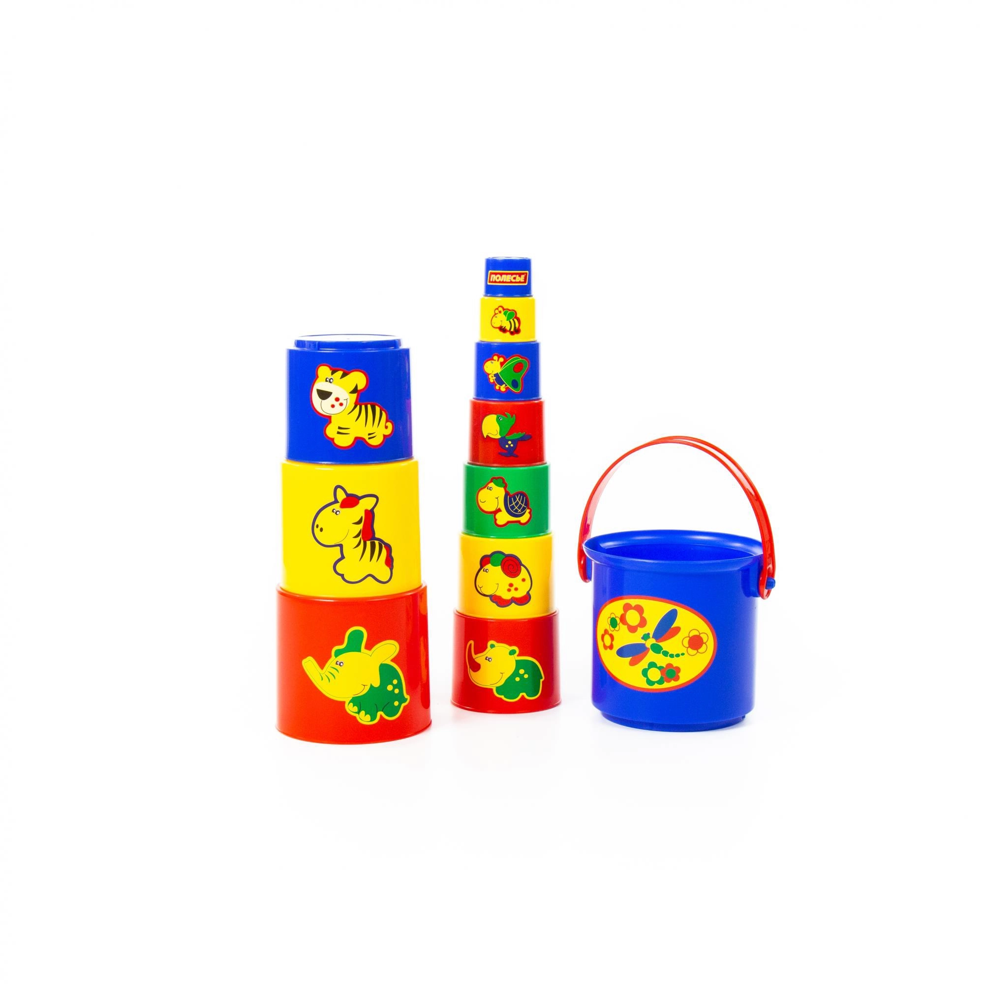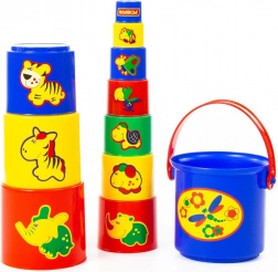 Wszystko jest praktycznie przechowywane w wiaderku o średnicy 14 cm, dzięki czemu zabawkę łatwo przenosić i odkładać na miejsce. Intensywne kolory i ilustracje zwierzątek wspierają rozpoznawanie kolorów oraz naukę rozmiarów – od najmniejszego elementu po największy.