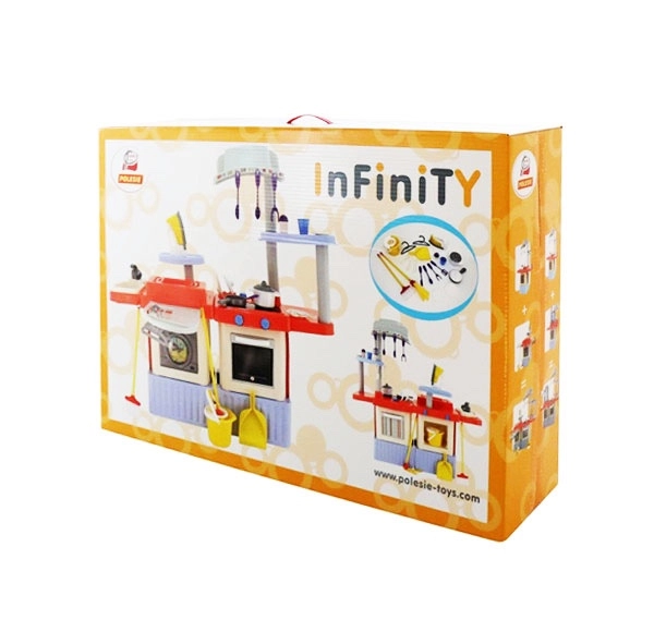 Kuchnia Infinity Premium zapewnia dzieciom kompletne domowe zaplecze do zabawy w gotowanie, pranie i prasowanie. Zestaw składa się z dwóch części: modułu kuchennego oraz modułu z pralką, zlewem i deską do prasowania – obie części można używać razem lub osobno. Dzięki bogatemu zestawowi akcesoriów zabawa jest natychmiast gotowa i realistyczna.