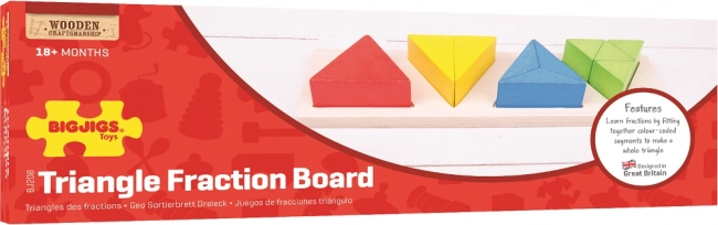 Cztery kolorowe zestawy trójkątów na drewnianej podstawie prowadzą dzieci do zrozumienia zasady części i całości. Idealne do pierwszego spotkania z ułamkami bez zbędnej presji.