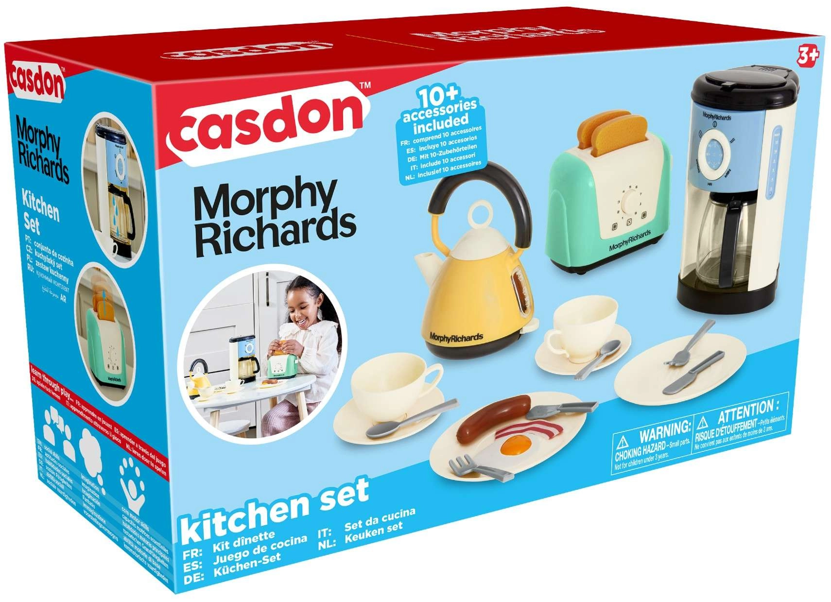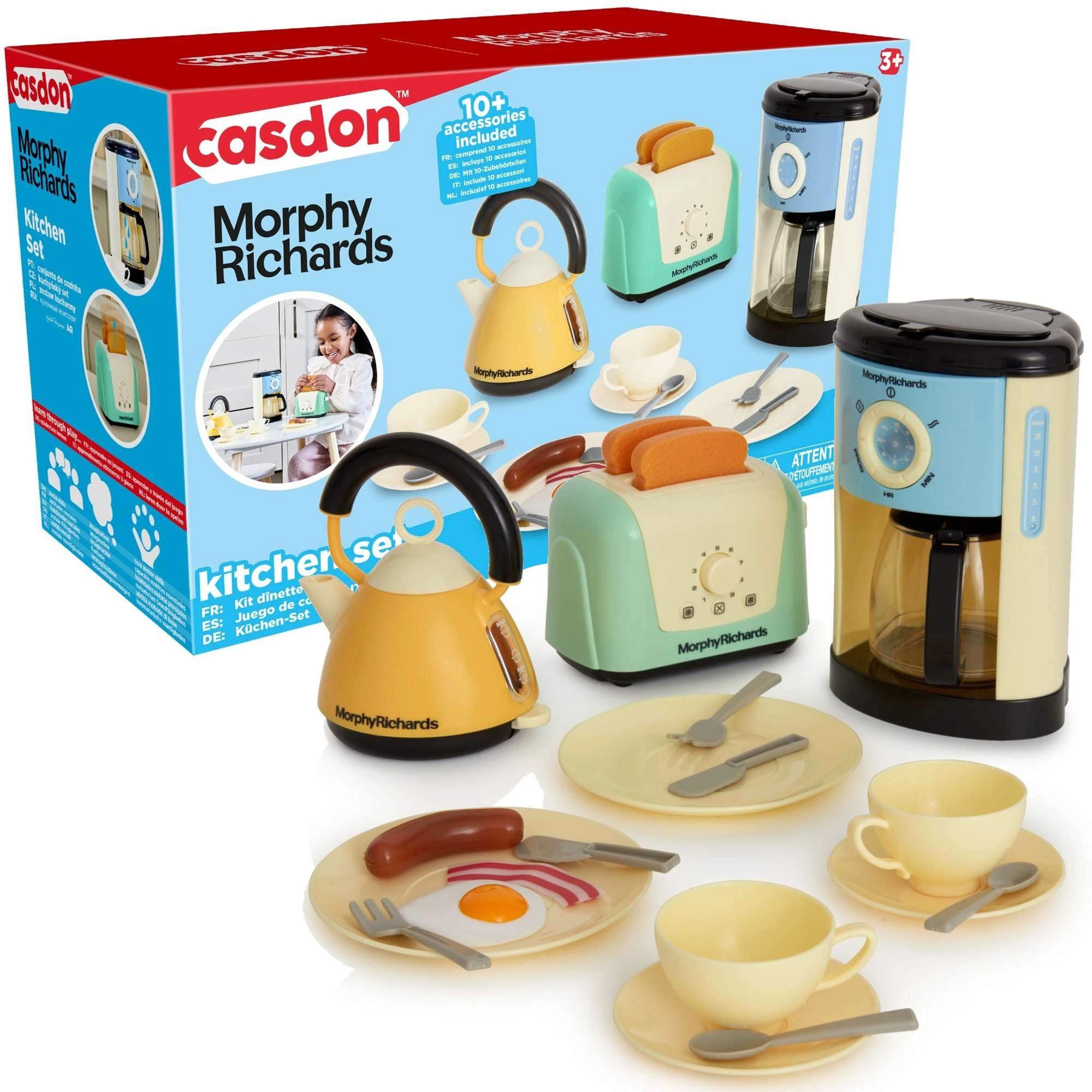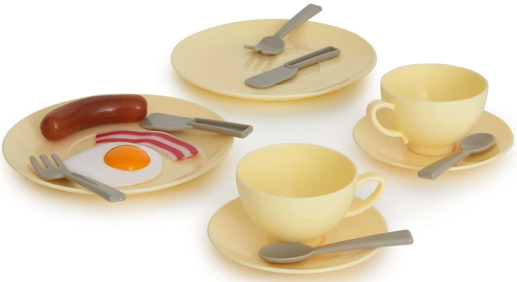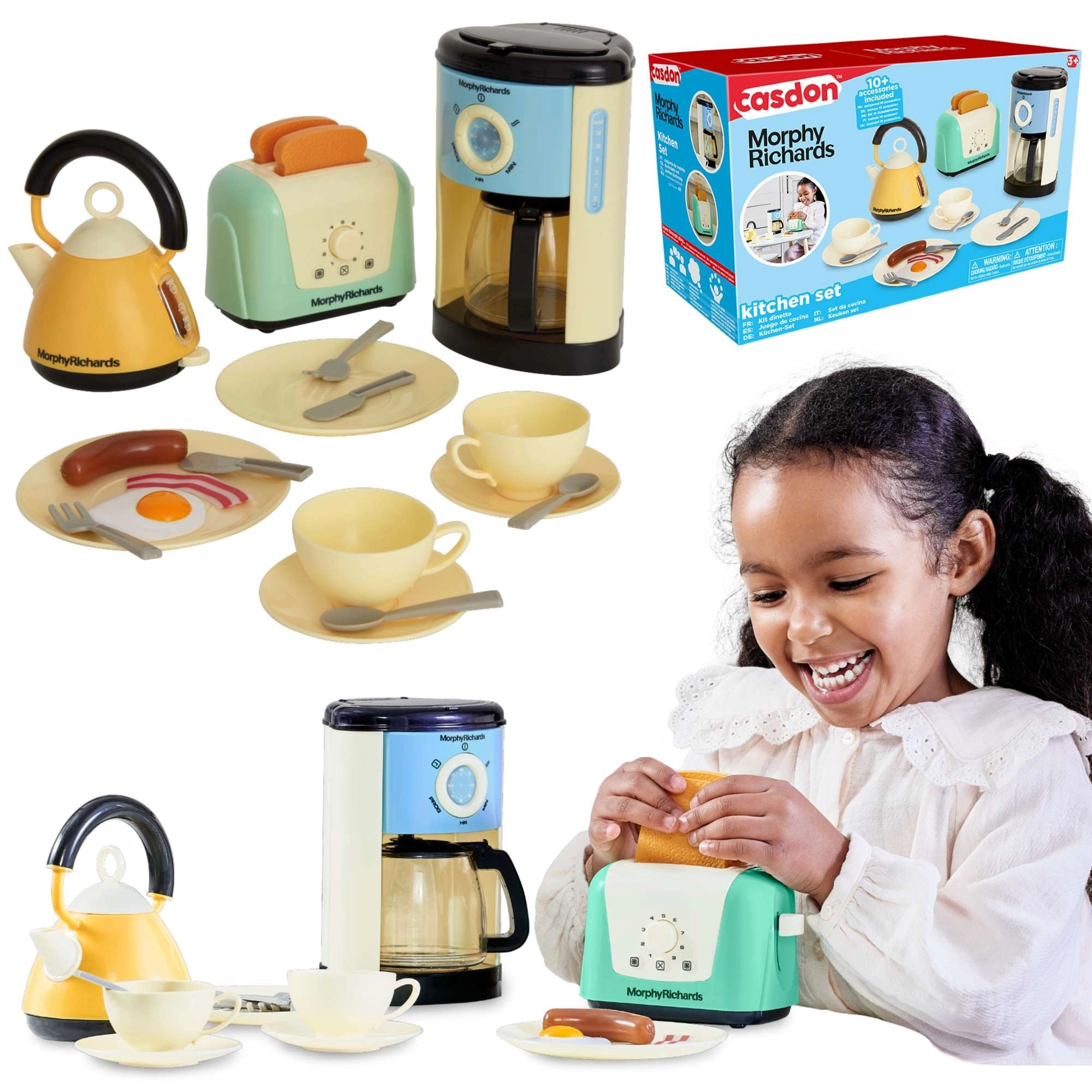 Ten dziecięcy zestaw kuchenny w nowoczesnym designie oferuje wszystko, czego mali kucharze potrzebują do przygotowania „idealnego śniadania”. W zestawie znajduje się ekspres do kawy z przepływem wody i dzbanuszkiem, czajnik elektryczny z wygodnym uchwytem i wskaźnikiem poziomu, toster z funkcją wyskakiwania tostów, talerzyki, sztućce, filiżanki ze spodkami oraz zestaw „produktów” (tosty, parówka, plaster bekonu i jajko sadzone).