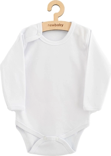 Wygodne niemowlęce body z długim rękawem marki New Baby w białym kolorze. Oferuje mięciutki, 100% bawełniany materiał, praktyczne zapięcie na napy na ramieniu i między nóżkami oraz łatwe przewijanie i ubieranie przez cały dzień.