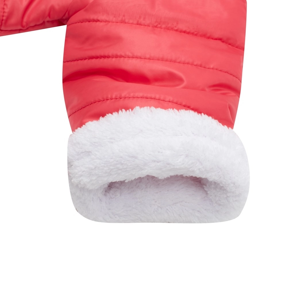 Kaptur z uroczymi uszkami oraz wywijane rękawy z miękkim mankietem chronią przed chłodem, a zamknięte stópki utrzymują nóżki w cieple. Antyalergiczne wypełnienie poliestrowe zwiększa termoizolację bez zbędnego obciążenia. Idealny do codziennego noszenia w wózku i na zimowe spacery.