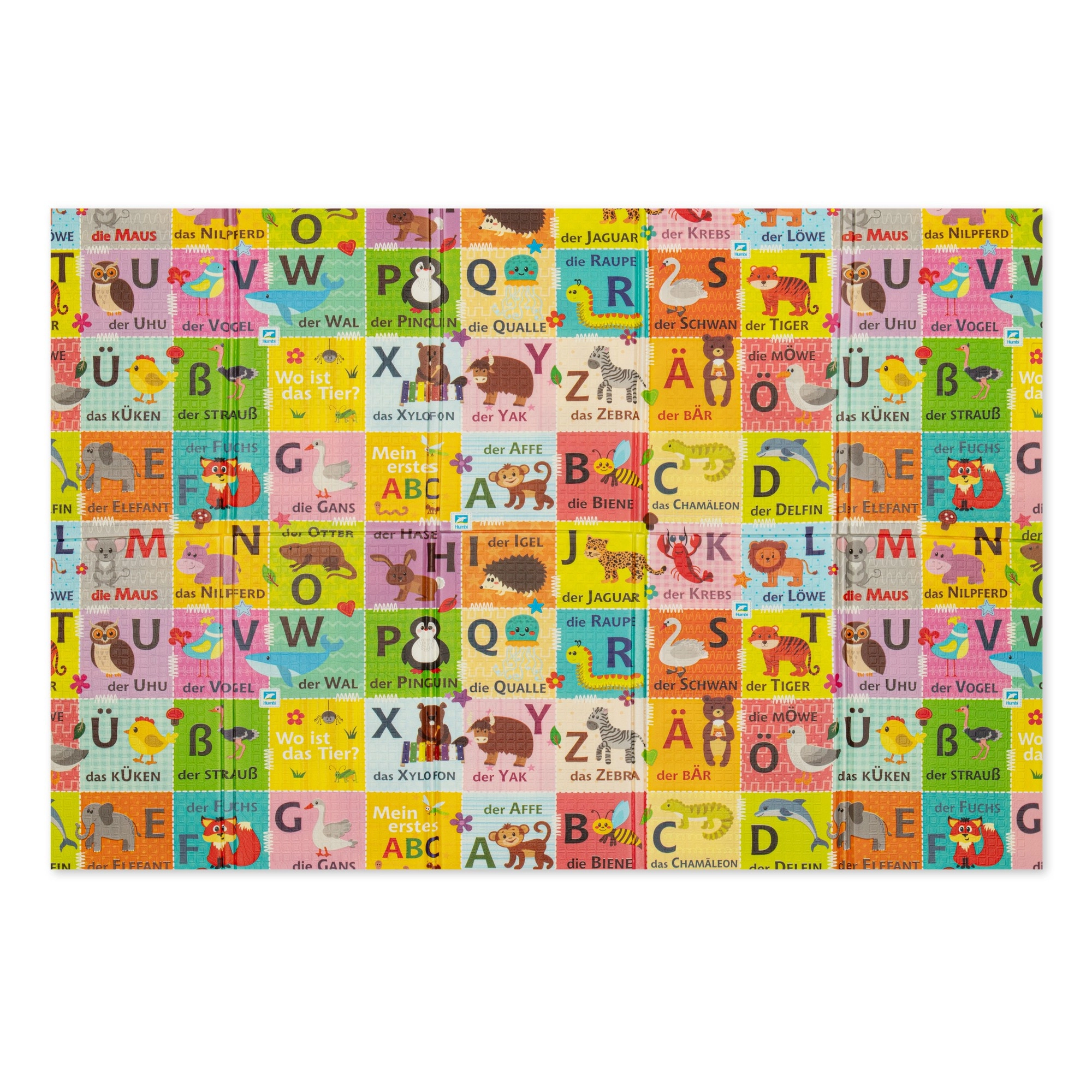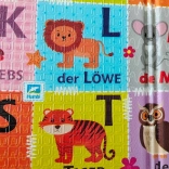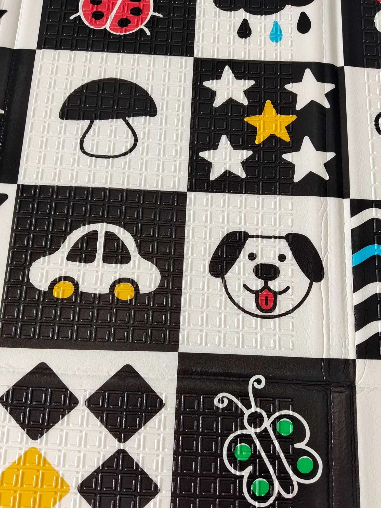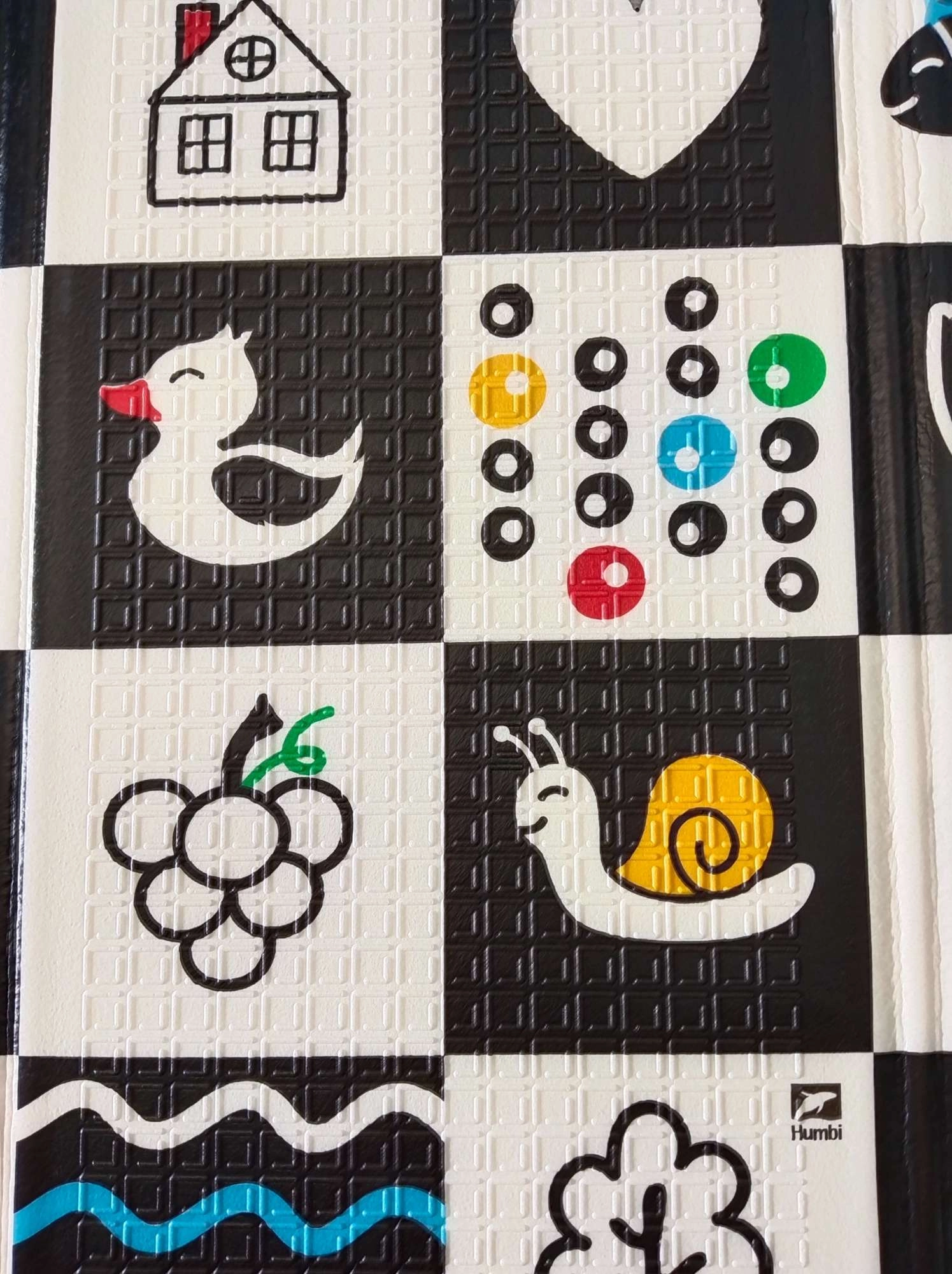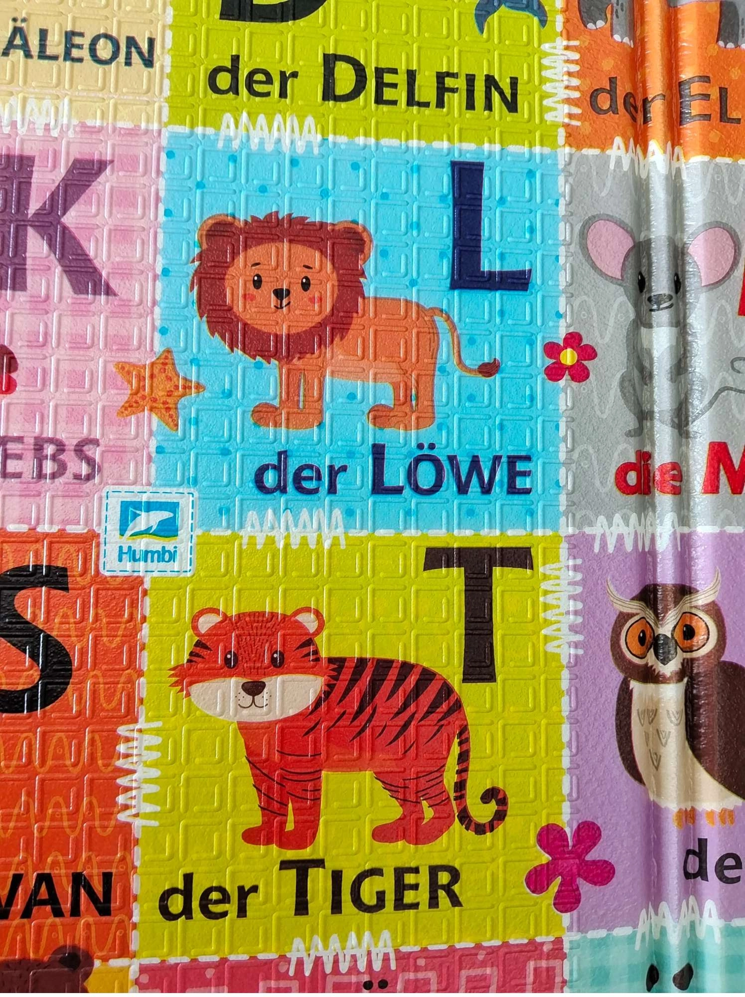 Dwustronna mata dziecięca HUMBI z wytrzymałej pianki XPE o wymiarach 120 × 180 cm oferuje miękką amortyzację, antypoślizgową powierzchnię oraz łatwe czyszczenie. Jedna strona jest kolorowa z niemieckim alfabetem i zwierzątkami, druga kontrastowa czarno-biała zapewnia stymulację wzroku niemowląt. Świetnie izoluje od chłodu, jest wodoodporna i nadaje się do zabawy, ćwiczeń oraz pierwszych kroczków.