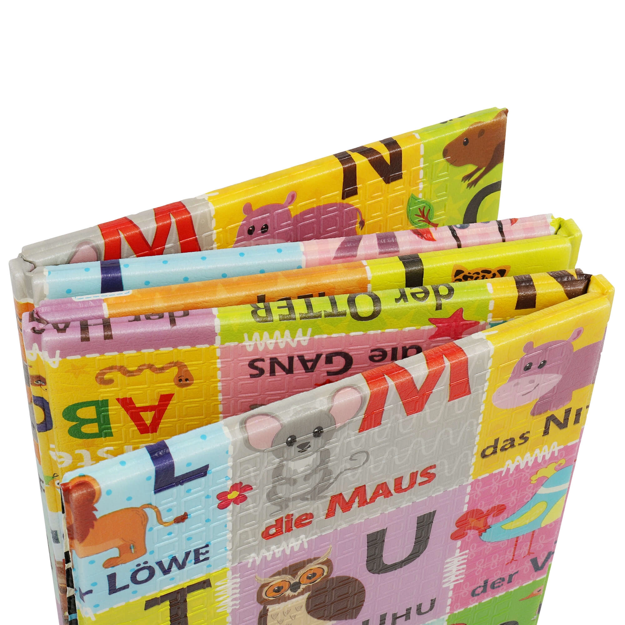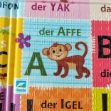 Kolorowa strona z niemieckim alfabetem i uroczymi zwierzątkami wspiera pierwsze zapoznanie z literami, a kontrastowa czarno-biała strona stymuluje wzrok i koncentrację.