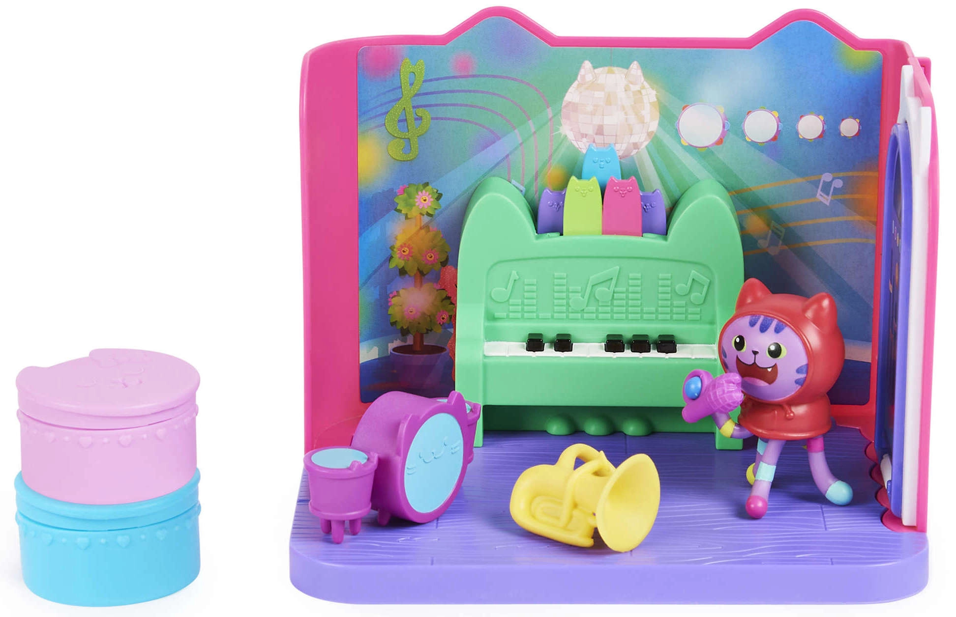 Rozszerz przygodę z Gabby’s Dollhouse o muzyczny pokój z figurką DJ Catnip! Ten zestaw zapewnia magiczną muzyczną zabawę, kreatywne odgrywanie ról oraz kompatybilność z innymi pokojami i domkiem. Dzieci pokochają działające klawisze pianina, które unoszą kolorowe kotki, oraz dopracowane detale akcesoriów, pobudzające nieograniczoną wyobraźnię.