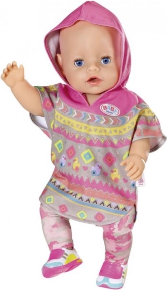 Podaruj swojej lalce BABY born nowy strój pełen kolorów i wygody. Ten zestaw łączy zabawny design z praktycznym wykonaniem – mięciutkie ponczo z kapturem, wygodne spodnie z maskującym wzorem oraz dobrane buciki tworzą harmonijny look na każdą okazję.