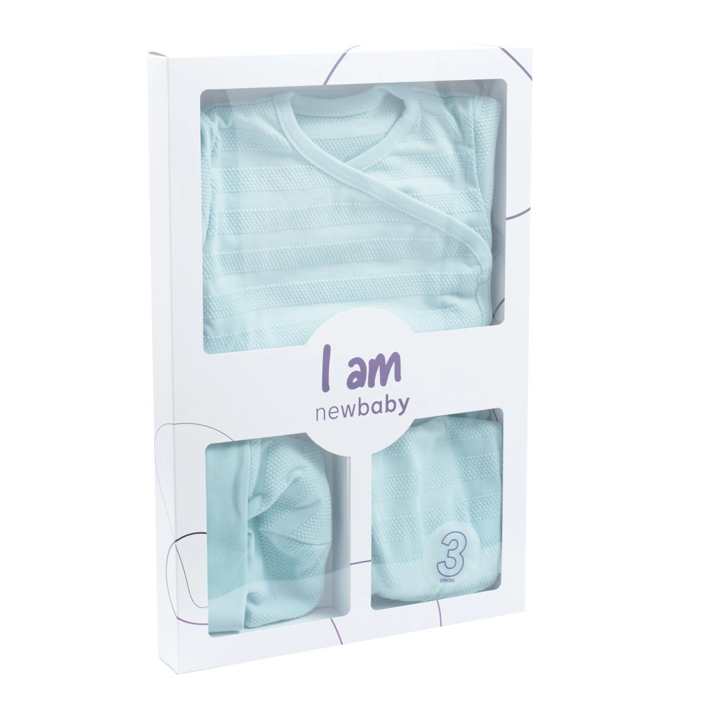 Ten noworodkowy zestaw New Baby I AM został zaprojektowany z myślą o maksymalnym komforcie i bezpieczeństwie. Body rozpinane jest na napy na całej długości oraz w kroku, co ułatwia przebieranie i przewijanie. Półśpiochy z szerszym pasem nie uciskają i świetnie trzymają. Czapeczka z szerszym ściągaczem nie spada i wygodnie leży.