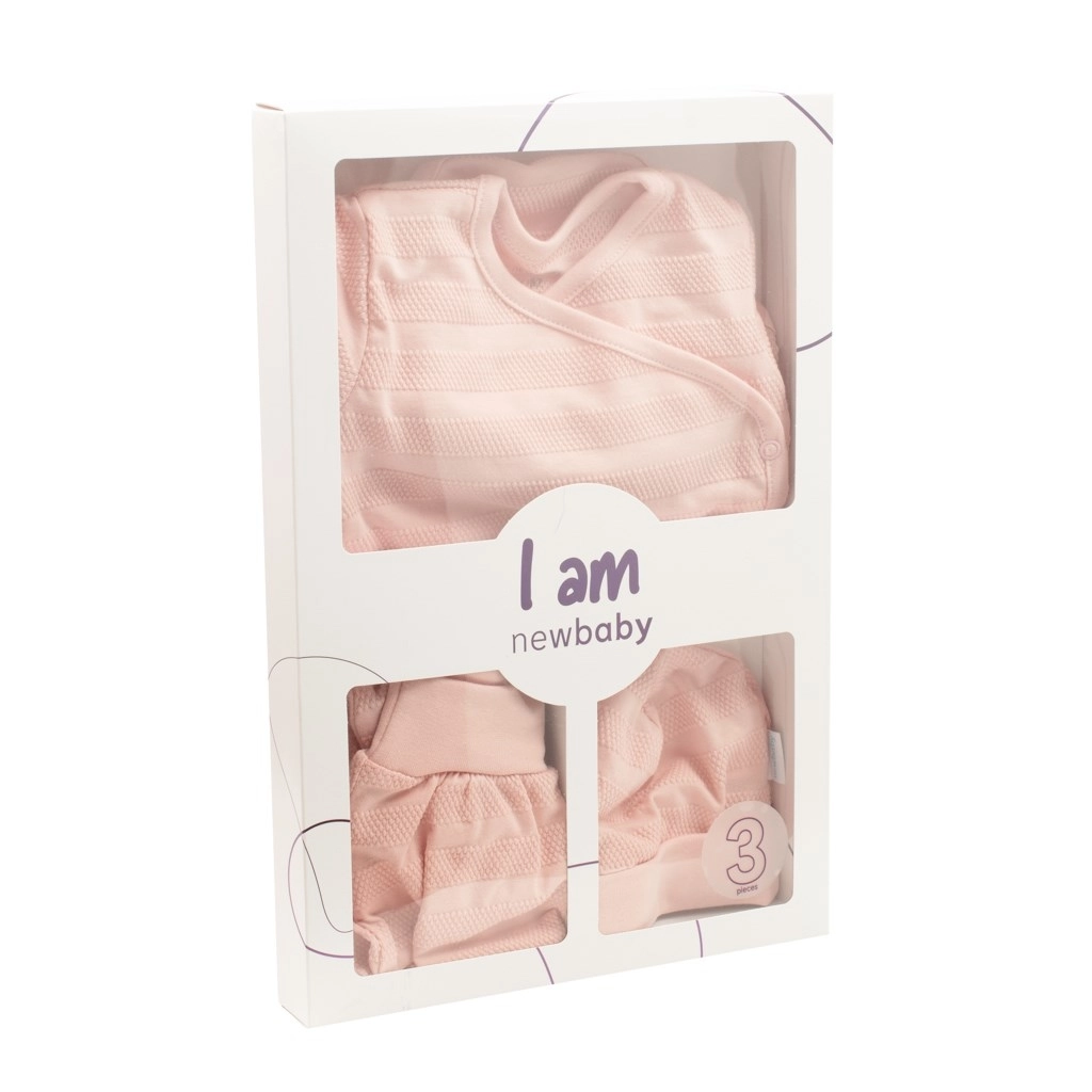 Ten 3‑częściowy niemowlęcy zestaw NEW BABY I AM został zaprojektowany z myślą o wrażliwej skórze maluszków. Delikatna bawełna, komfortowe kroje i przemyślane detale ułatwiają codzienne ubieranie i przewijanie. Neutralny różowy wygląd z subtelną strukturą prezentuje się łagodnie i czysto.