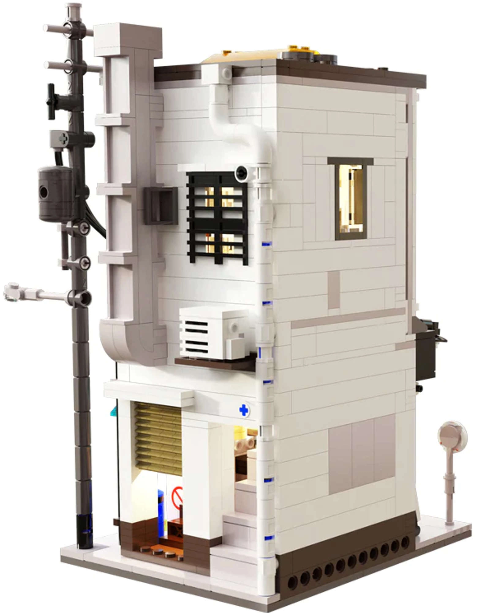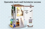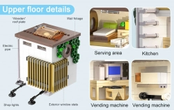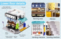 Otwierana ściana boczna odsłania szczegółowo wyposażone pomieszczenia – od lady sprzedażowej i automatu z napojami po schody i przytulną sypialnię z komputerem, łóżkiem, szafą i klimatyzacją. Zewnętrzne detale, takie jak słup elektryczny, kanał wentylacyjny, okna, rynna, klimatyzator, szyld i menu, podkreślają kolekcjonerski charakter modelu.