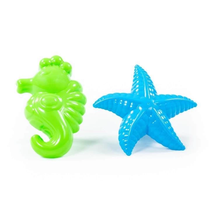 Odkryj zabawę nad wodą i w piaskownicy z zestawem foremek do piasku w motywie podwodnego świata. Dzięki dwóm ulubionym kształtom – konik morski i rozgwiazda – dzieci poćwiczą małą motorykę, kreatywność i przeżyją mnóstwo radości przy budowaniu własnych piaskowych królestw.
