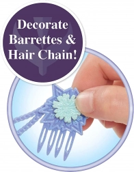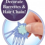 Szczotka, ozdobny łańcuszek do włosów, 4 kryształki, 4 spinki, 4 gumki i 2 pasemka do zaplatania – wszystko, czego dzieci potrzebują do tworzenia oryginalnych fryzur.