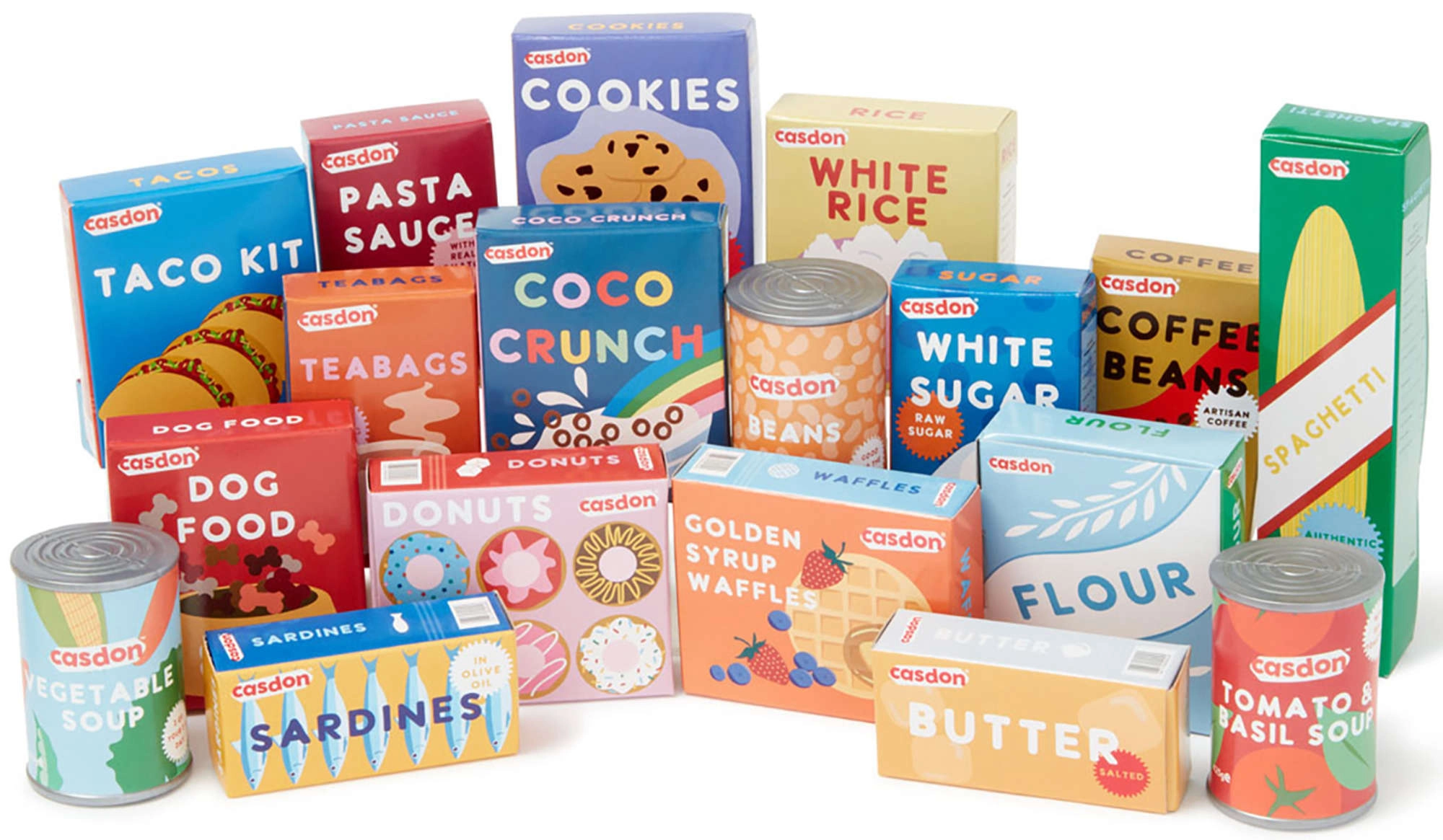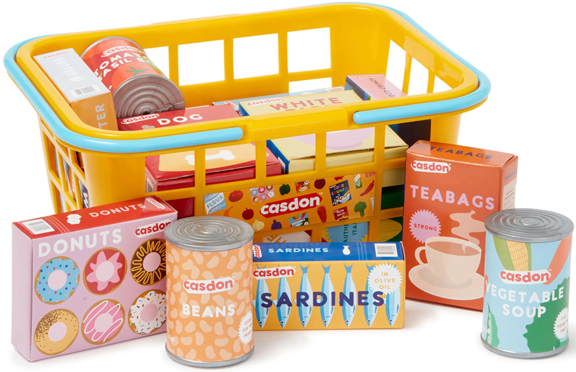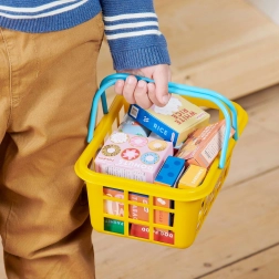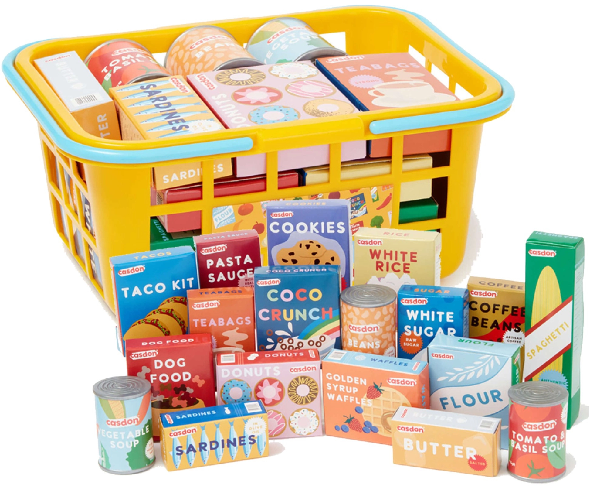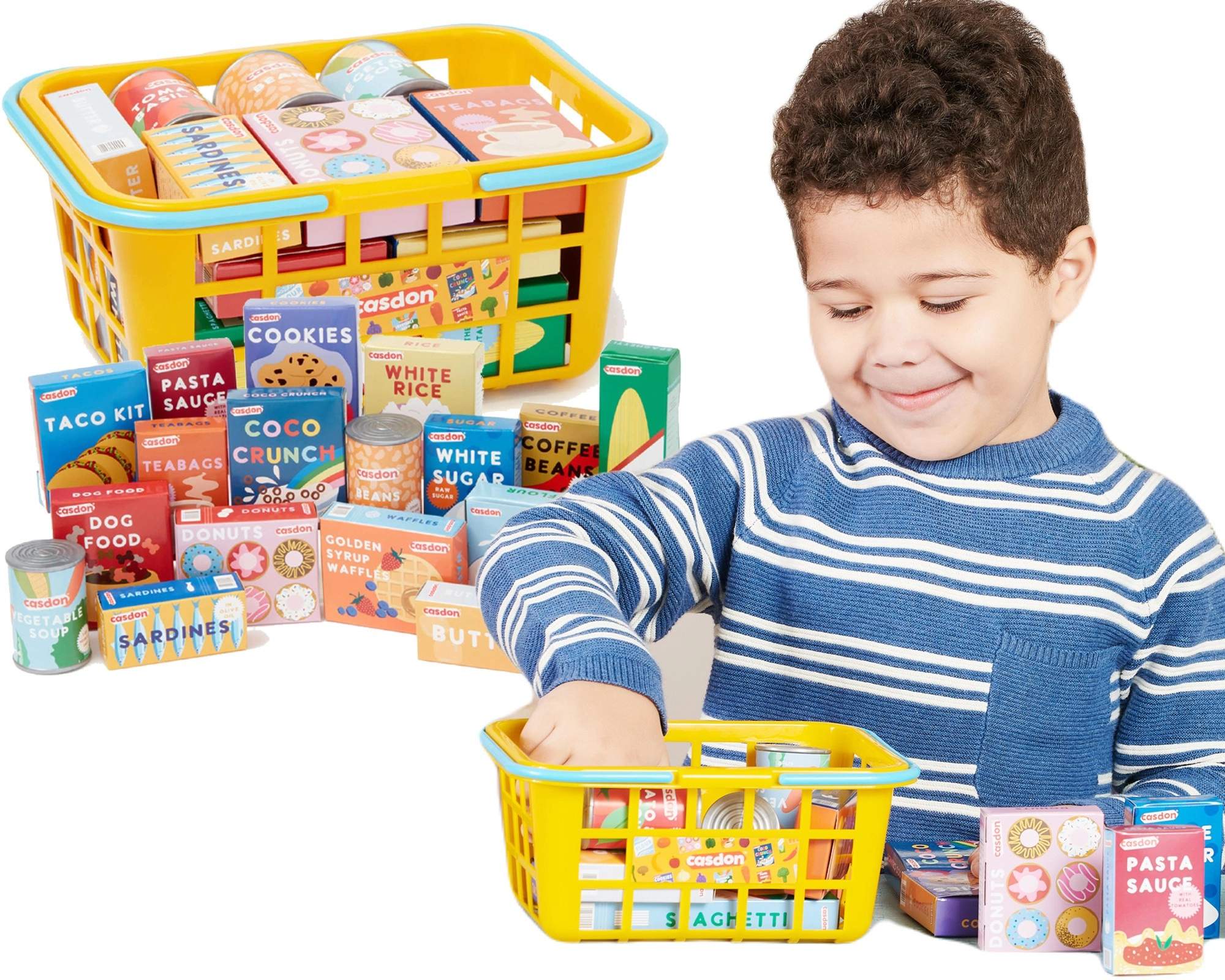 Ten jakościowy zestaw marki CASDON został zaprojektowany dla małych miłośników zabawy w sklep. Koszyk jest lekki, trwały i bezpieczny dla dziecięcych rąk, rozmiarem dopasowany do dzieci. W środku znajduje się bogaty wybór realistycznie zadrukowanych pudełek i puszek, które stymulują wyobraźnię i umiejętności komunikacyjne.