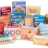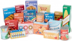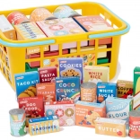 Kolorowe pudełka i puszki z nadrukami ciastek, mąki, fasoli czy zupy pobudzają wyobraźnię i tematyczną zabawę w sklep.