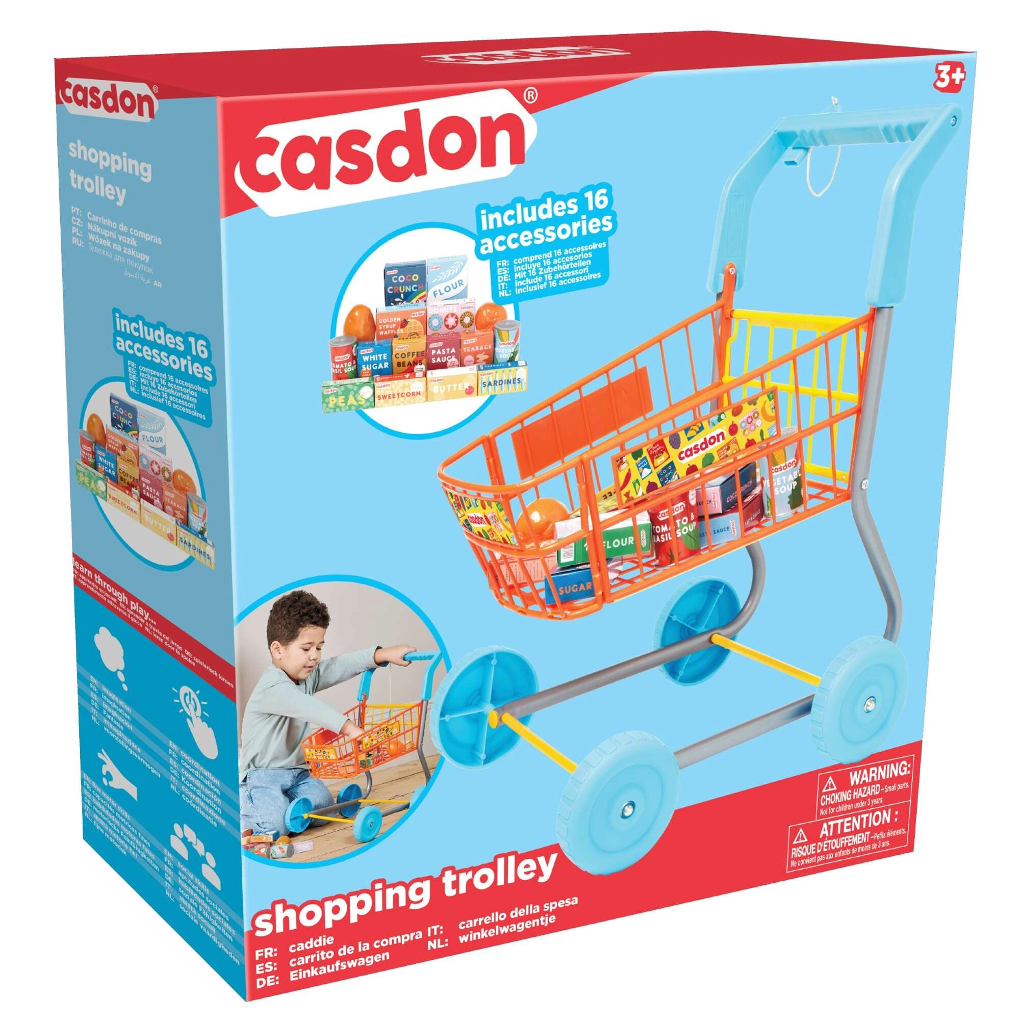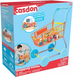 W zestawie znajduje się 16 realistycznie zadrukowanych pudełek i puszek z żywnością oraz plastikowe owoce/warzywa, które pomagają dzieciom ćwiczyć sortowanie, liczenie i umiejętności społeczne podczas zabawy w sklep. Przy rączce zawieszony jest mały gwizdek/żeton dla jeszcze bardziej autentycznych wrażeń z zakupów.