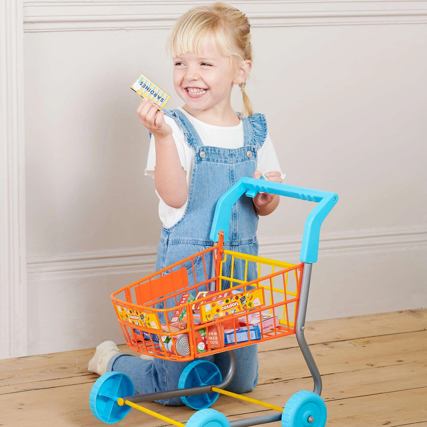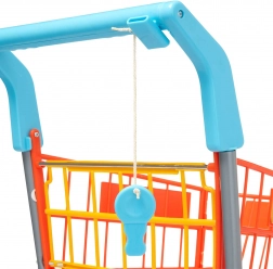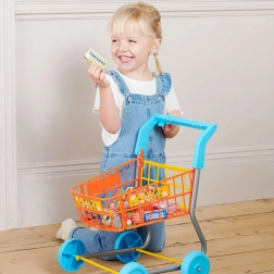 Ten dziecięcy wózek zakupowy to świetny wybór dla małych sprzedawców i klientów. Dzięki połączeniu pomarańczowego koszyka, niebieskiej rączki i kółek oraz żółtych detali prezentuje się atrakcyjnie i wspiera kreatywną zabawę. Szerokie koła zapewniają stabilność i łatwe manewrowanie w pomieszczeniach.