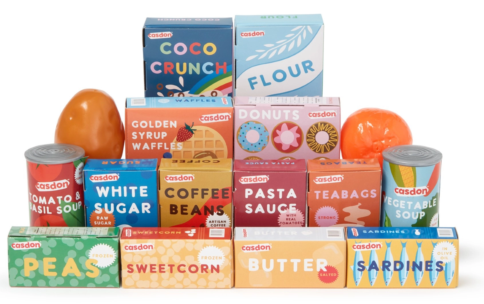 W komplecie 16 sztuk imitacji żywności: pudełka i puszki z nadrukami (mąka, herbata, kawa, groszek, cukier itp.) oraz plastikowe owoce/warzywa.