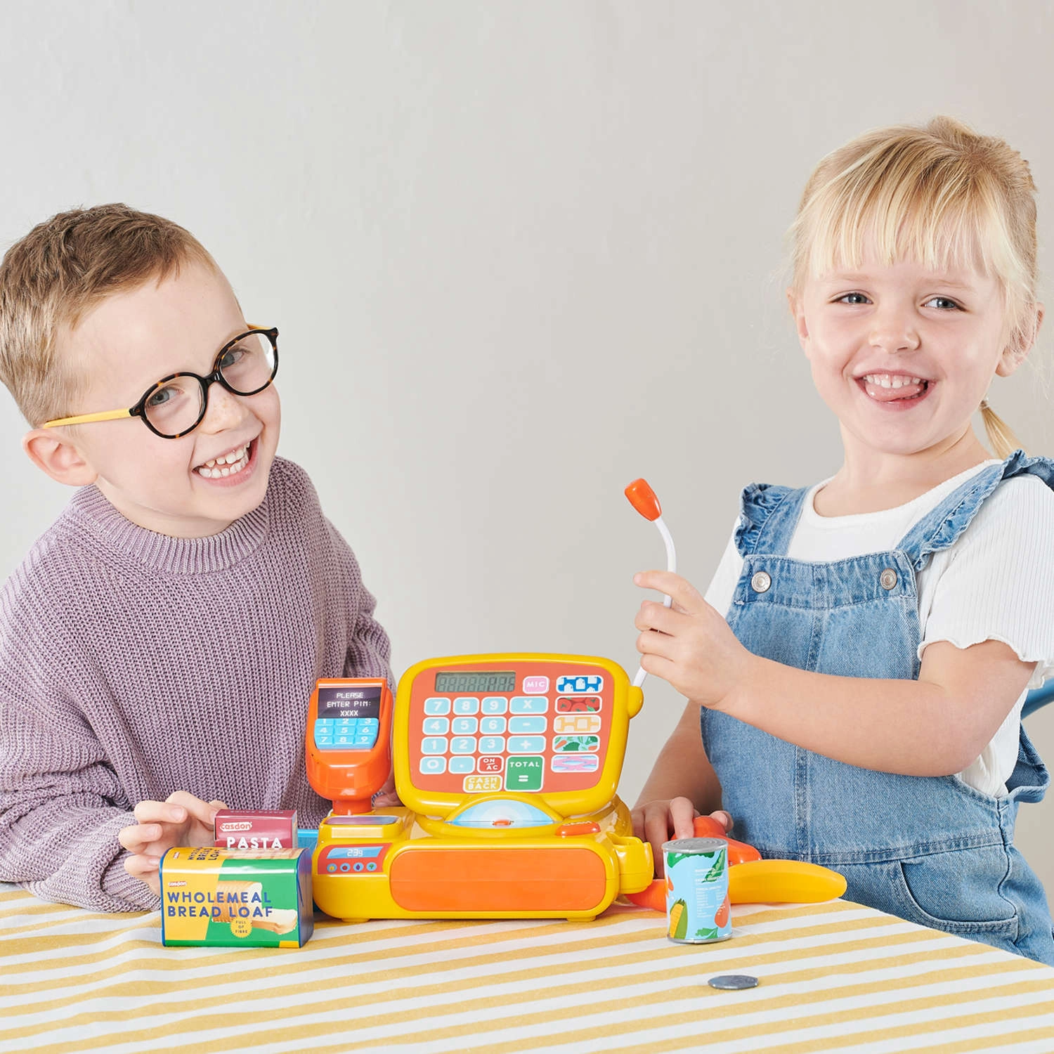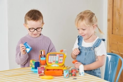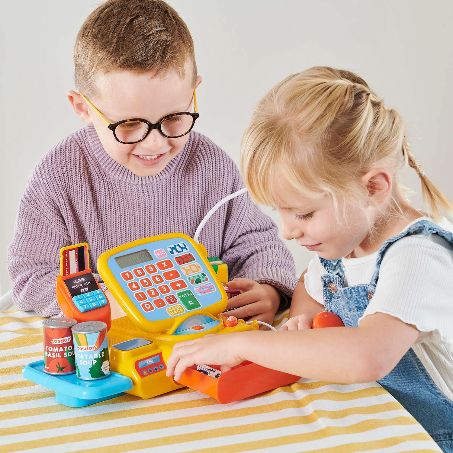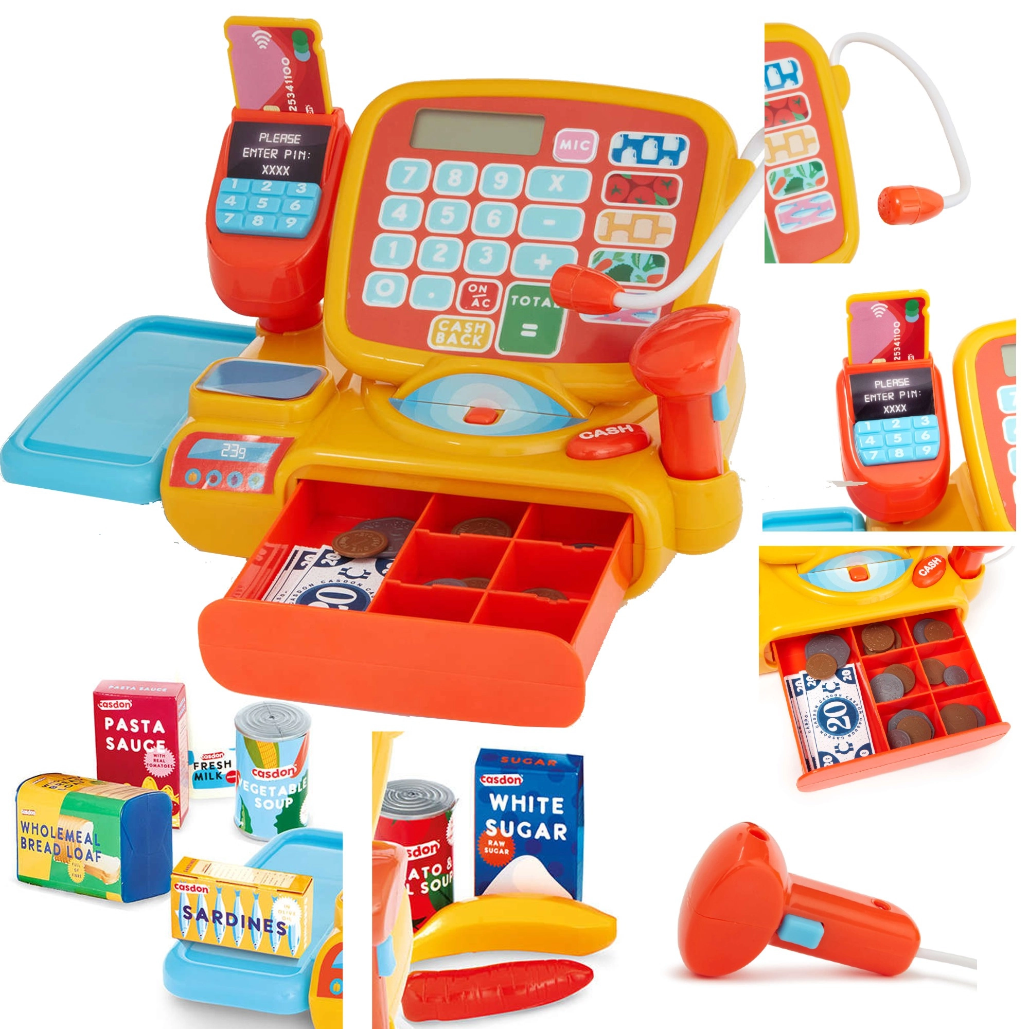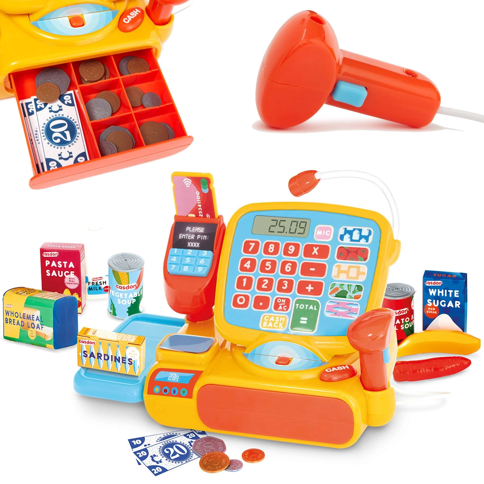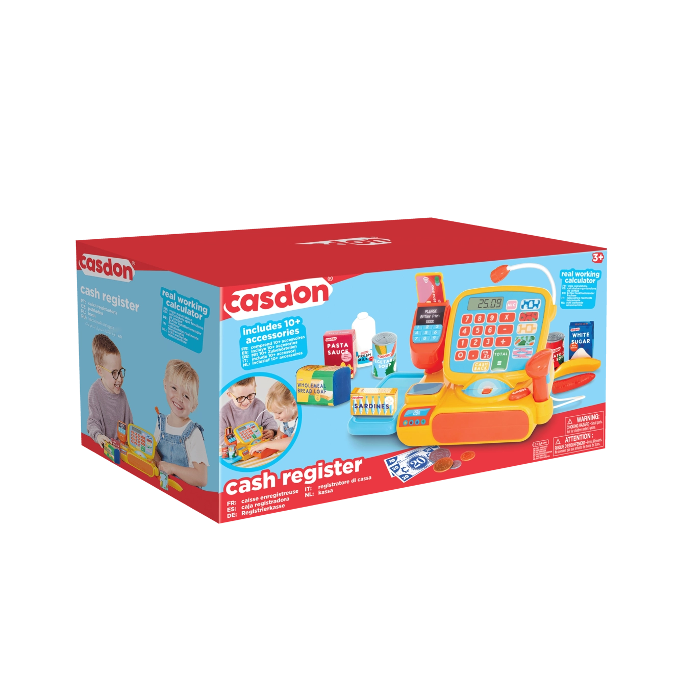 Kolorowa dziecięca kasa CASDON oferuje realistyczną zabawę w sklep z bogatym wyposażeniem. Ma sprawny wyświetlacz z kalkulatorem, skaner kodów kreskowych, czytnik kart, wagę oraz wysuwaną szufladę na pieniądze. W zestawie znajdują się banknoty, monety, karta płatnicza i atrapy produktów spożywczych. Nie brakuje efektów dźwiękowych oraz mikrofonu dla jeszcze bardziej realistycznych wrażeń.