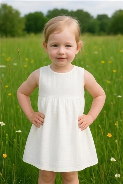 Urocza dziecięca sukienka New Baby Elizabeth uszyta jest z delikatnego muślinu, który wyróżnia się oddychalnością, miękkością i lekkością. Krój w literę A bez rękawów uzupełnia pięknie marszczona spódniczka oraz zapięcie na nap na plecach, które ułatwia szybkie ubieranie.