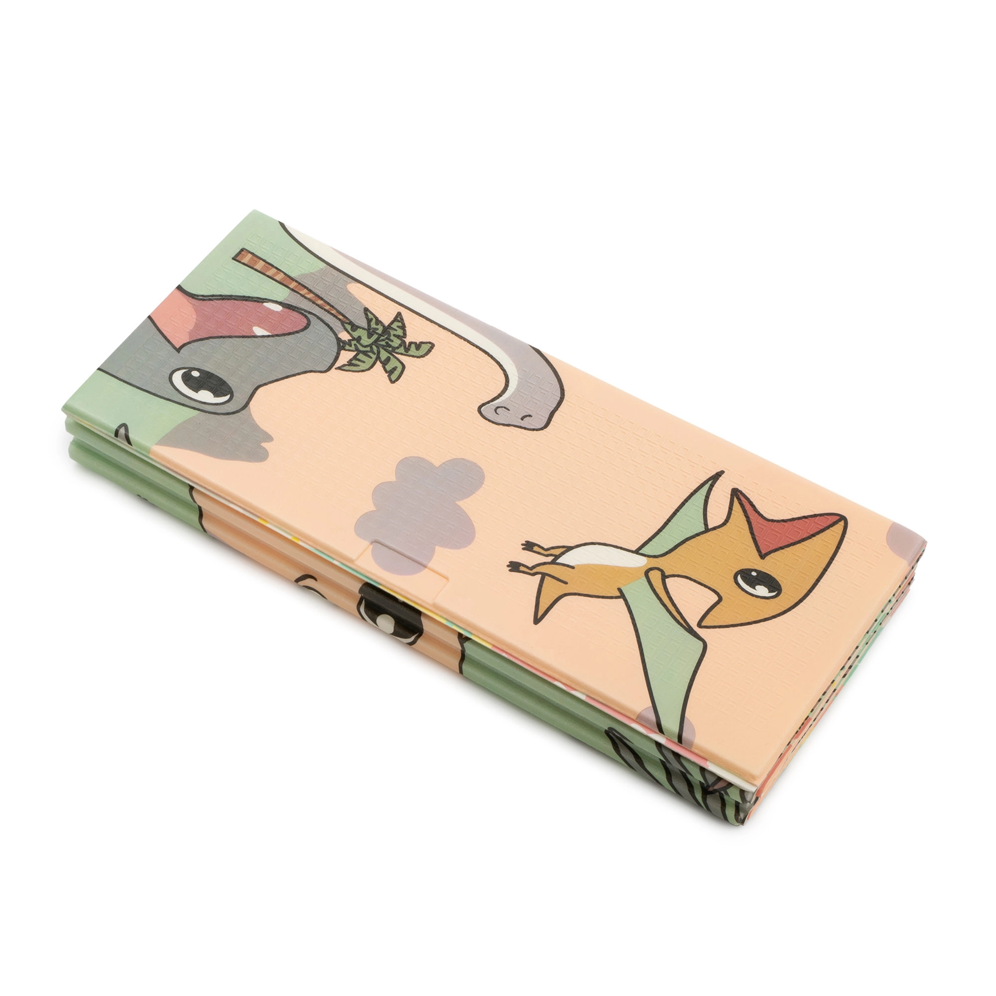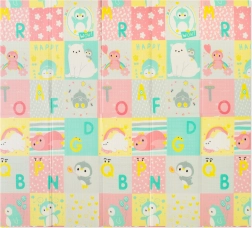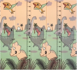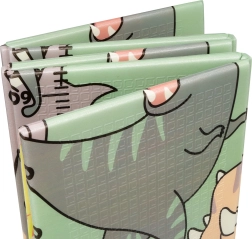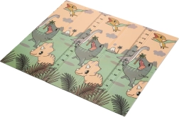Obie strony mają edukacyjny nadruk w delikatnych pastelowych kolorach: urocze dinozaury z miarką wzrostu oraz motyw zwierzątek i liter. Antypoślizgowy relief wspiera bezpieczną naukę raczkowania i chodzenia, a jednocześnie stymuluje rozwój sensoryczny. Powierzchnia jest wodoodporna – wystarczy przetrzeć wilgotną ściereczką.