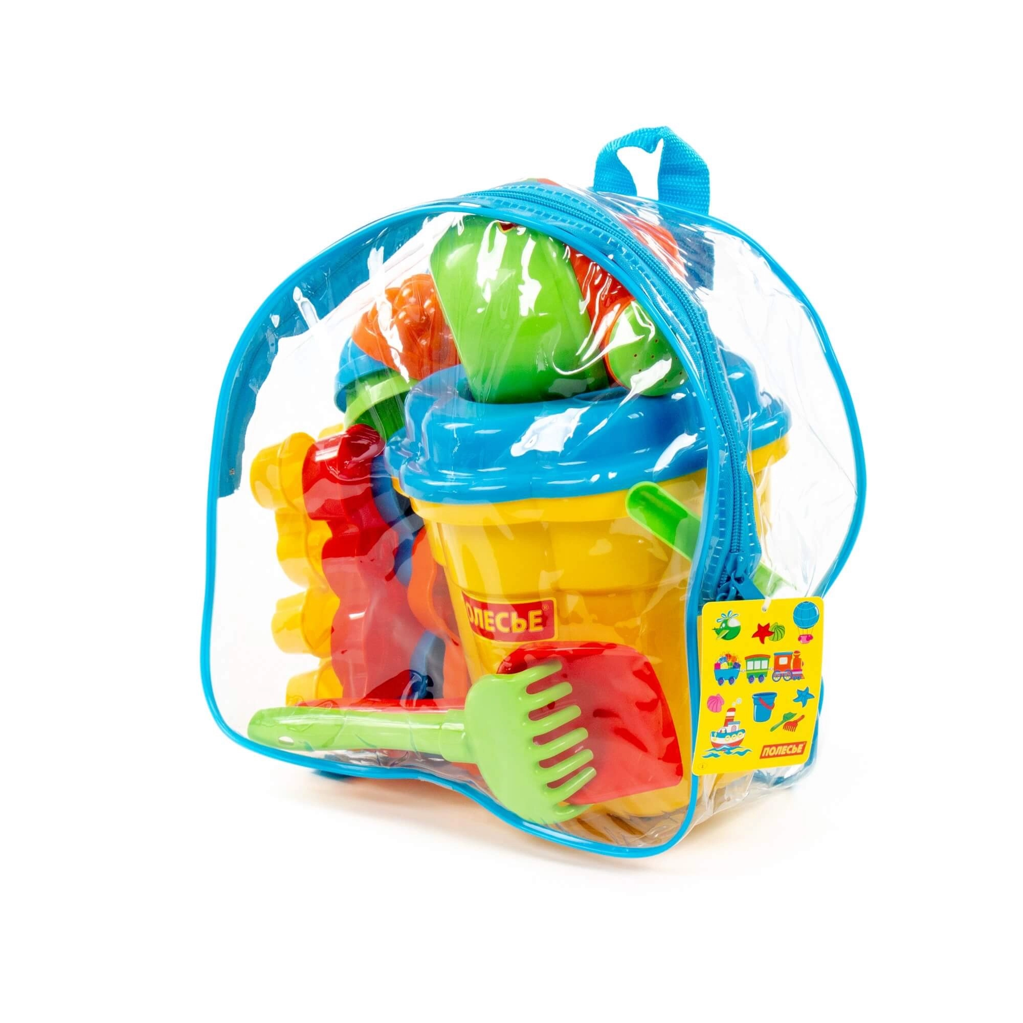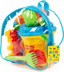 Praktyczny zestaw do piasku w przezroczystym plecaku ucieszy każdego małego budowniczego. Zawiera wiaderko, 4 foremki zwierzątek, 3 foremki babek z piasku, łopatkę, grabki i konewkę – wszystko gotowe do zabawy na placu zabaw i na plaży.