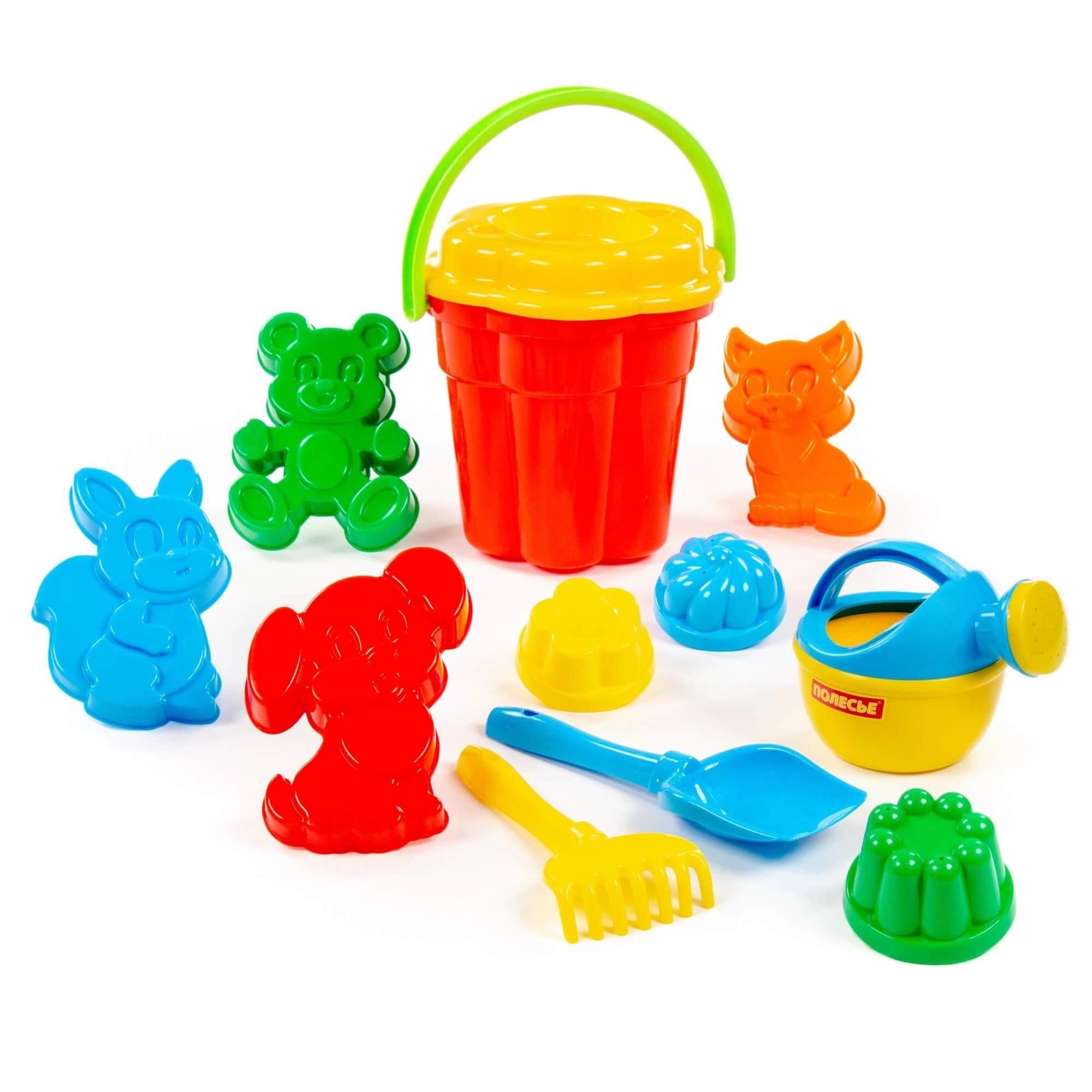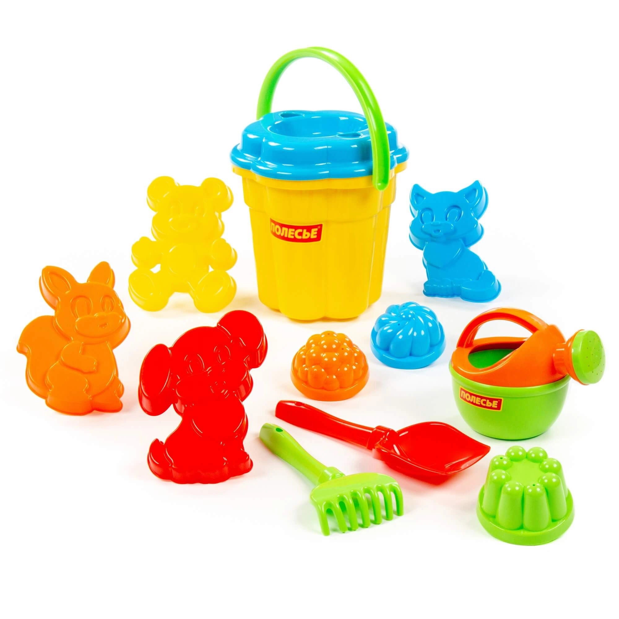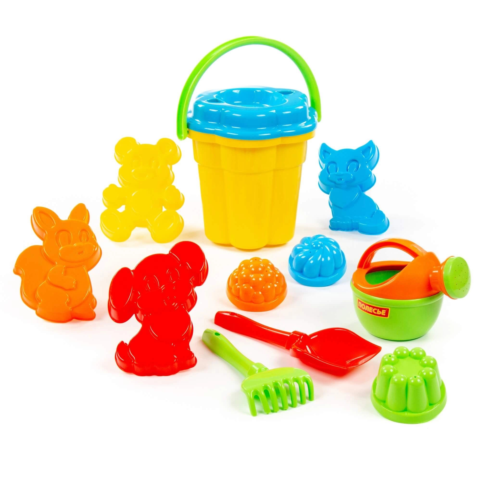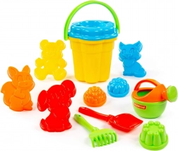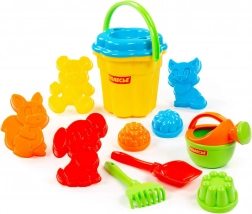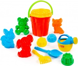 Wiaderko, 4× foremka zwierzątko, 3× foremka babka, łopatka, grabki, konewka