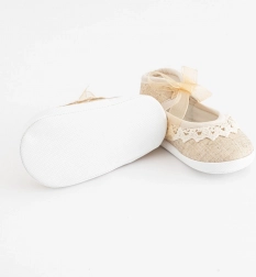 Buciki wykonane są z delikatnej koronki (100% poliester) i mają cienką syntetyczną podeszwę z PVC bez BPA. Dzięki bardzo niskiej masie są przyjemne w noszeniu, zarówno w domu, jak i na uroczyste okazje. Dostarczane w praktycznym pudełku prezentowym.