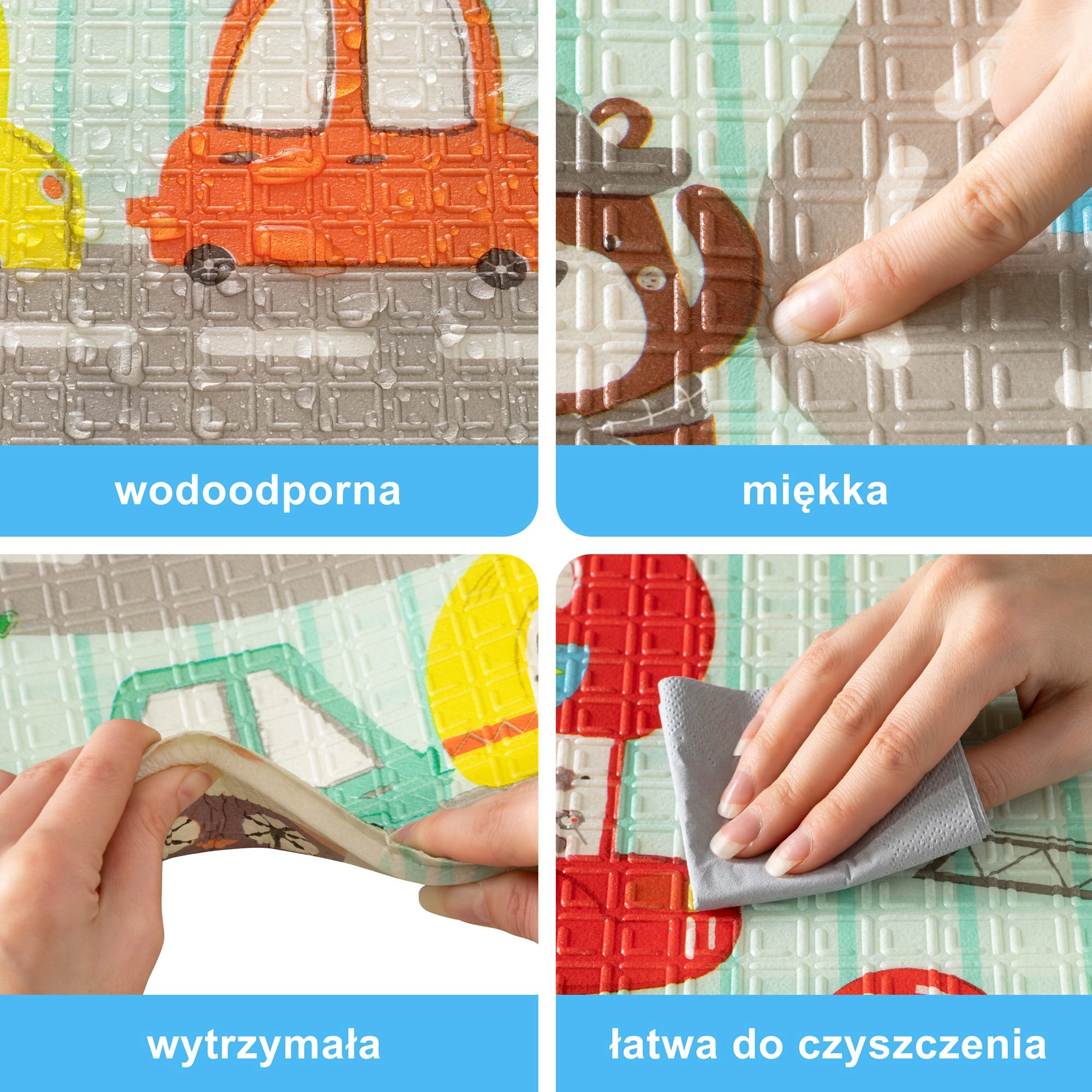 Praktyczna dwustronna mata dziecięca HUMBI z wysokiej jakości pianki XPE o wymiarach 120 × 180 × 0,8 cm zapewni miękką, bezpieczną i wodoodporną powierzchnię do zabawy, raczkowania i pierwszych kroków. Jest lekka, szybko się składa, łatwo się czyści i w zestawie ma torbę do przenoszenia. Jedna strona oferuje motyw leśnych zwierzątek, druga kolorowe drogi i miasto rozwijające wyobraźnię.