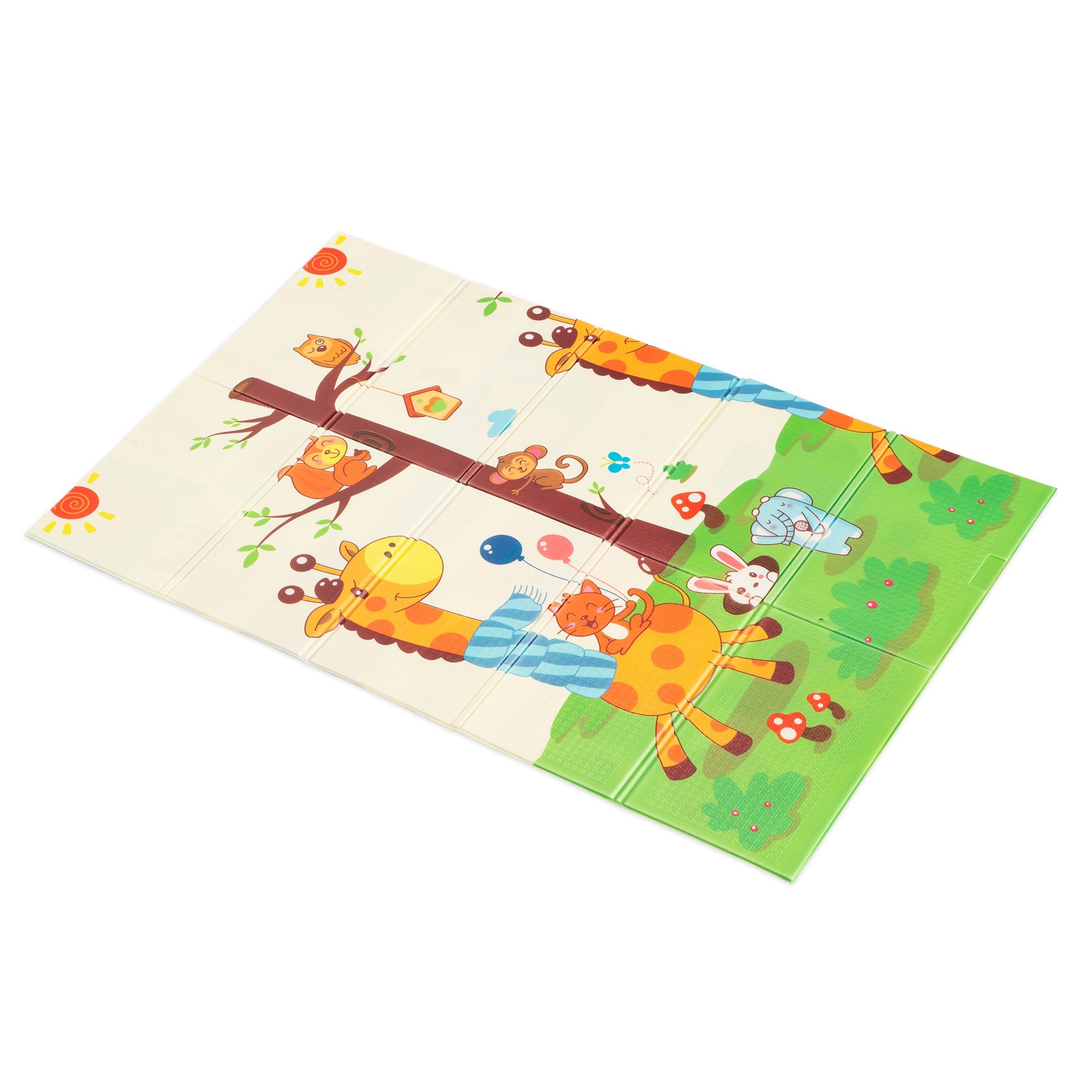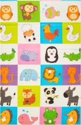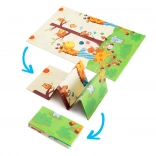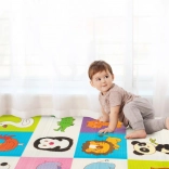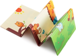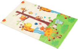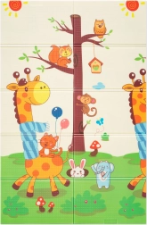 Pianka XPE klasy premium jest bezzapachowa, nietoksyczna i odporna na zużycie. Dzięki grubości 0,8 cm świetnie tłumi uderzenia i zapewnia izolację od chłodnej podłogi. Obie strony zdobią atrakcyjne nadruki – jedna z uroczymi żyrafami, druga ze zwierzątkami na kolorowym tle – wspierające rozwój wzrokowy dzieci.