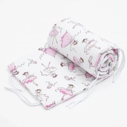 Dzięki praktycznym troczkom ochraniacz łatwo i stabilnie przymocujesz do łóżeczka. Subtelny nadruk tańczącej baleriny działa kojąco i pięknie uzupełni wyprawkę do pokoju dziecięcego.