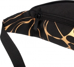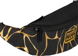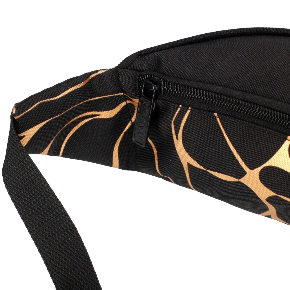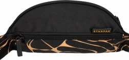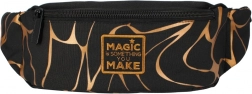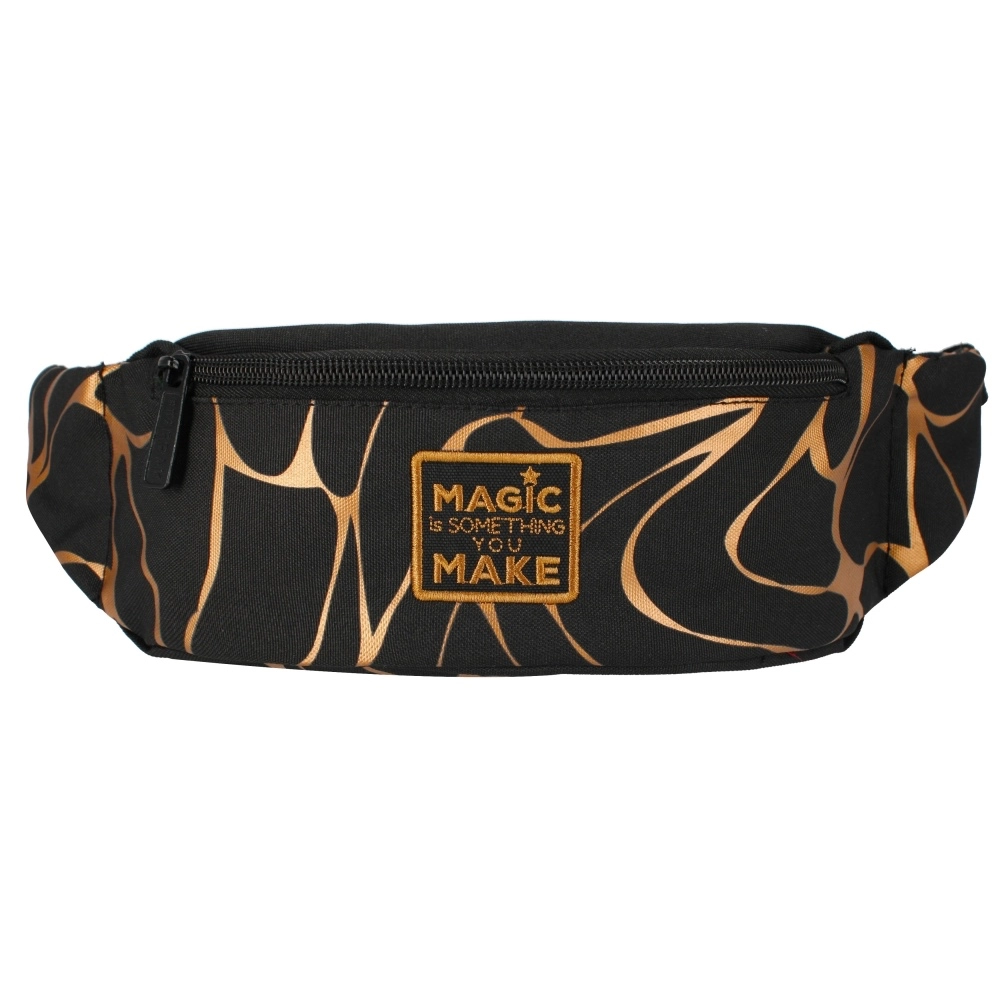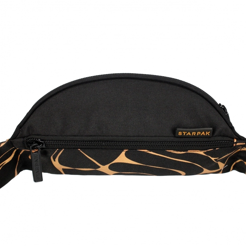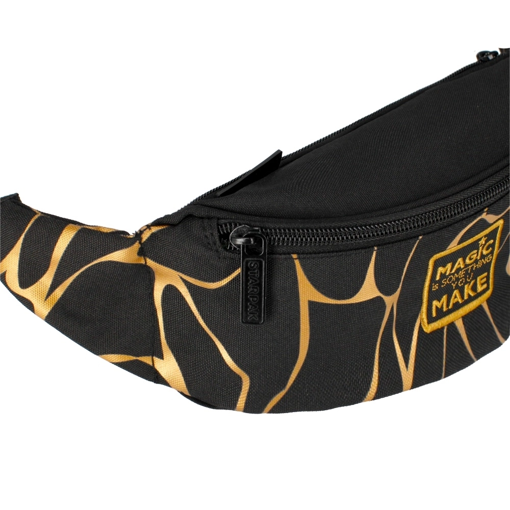 Odkryj wygodę i wolne ręce z nerką STARPAK Golden. Elegancki czarny design z wyrazistym nadrukiem i tekstylną naszywką „Magic is something you make” dopełnia funkcjonalne wykonanie: dwie kieszenie na zamek utrzymają drobiazgi w porządku i bezpieczeństwie, a regulowany pasek pozwala nosić nerkę w pasie lub na skos przez klatkę piersiową.