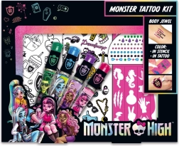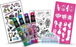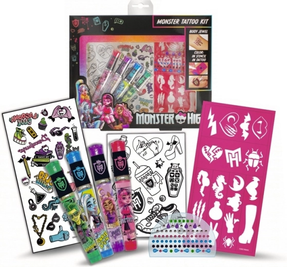 Odkryj magię świata MONSTER HIGH i stwórz oryginalne, tymczasowe tatuaże pełne blasku i fantazji. Zestaw zawiera 4 brokatowe długopisy żelowe, metaliczne tatuaże naklejane, kryształki, ozdobne naklejki oraz szablony do łatwego i precyzyjnego zdobienia. Idealny dla dzieci, na kreatywne przyjęcia i jako prezent.