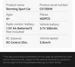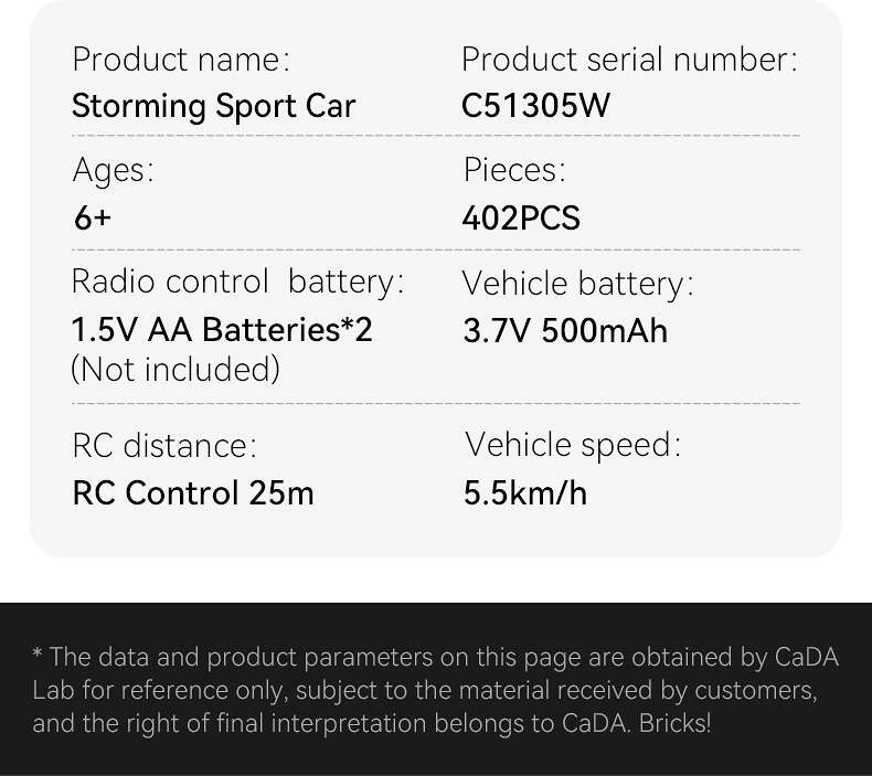 Samochód sportowy CaDA wyróżnia się realistycznymi proporcjami, solidną konstrukcją i atrakcyjną białą karoserią z czarnymi elementami. Dzięki napędom i precyzyjnemu układowi kierowniczemu cieszy płynną jazdą do przodu i do tyłu oraz dokładnym skręcaniem. Dual Mode umożliwia sterowanie klasycznym pilotem lub smartfonem z Bluetooth – zabawa w domu i na zewnątrz.