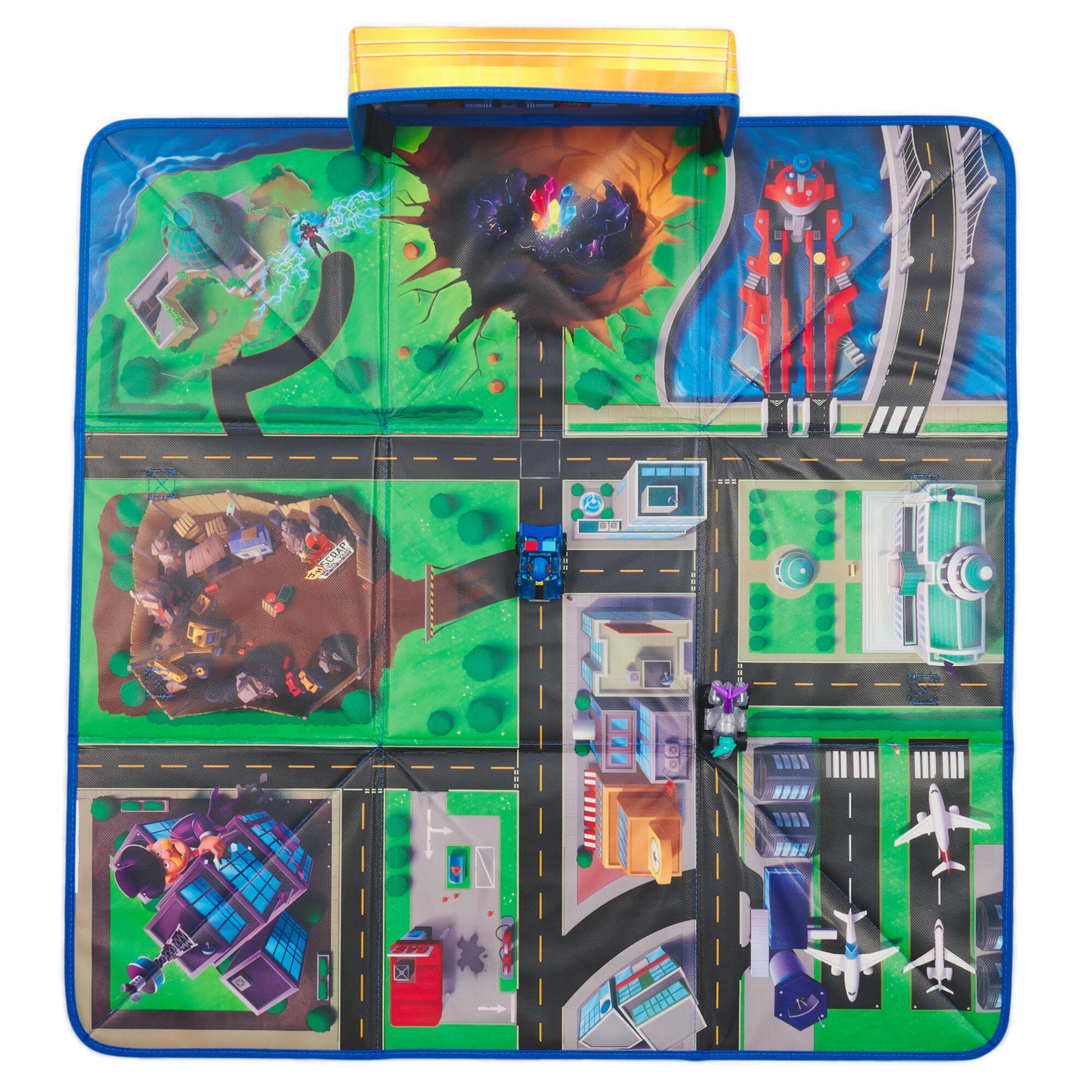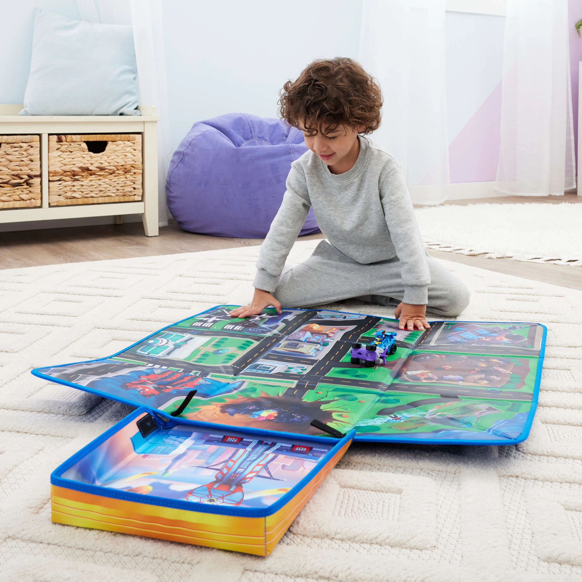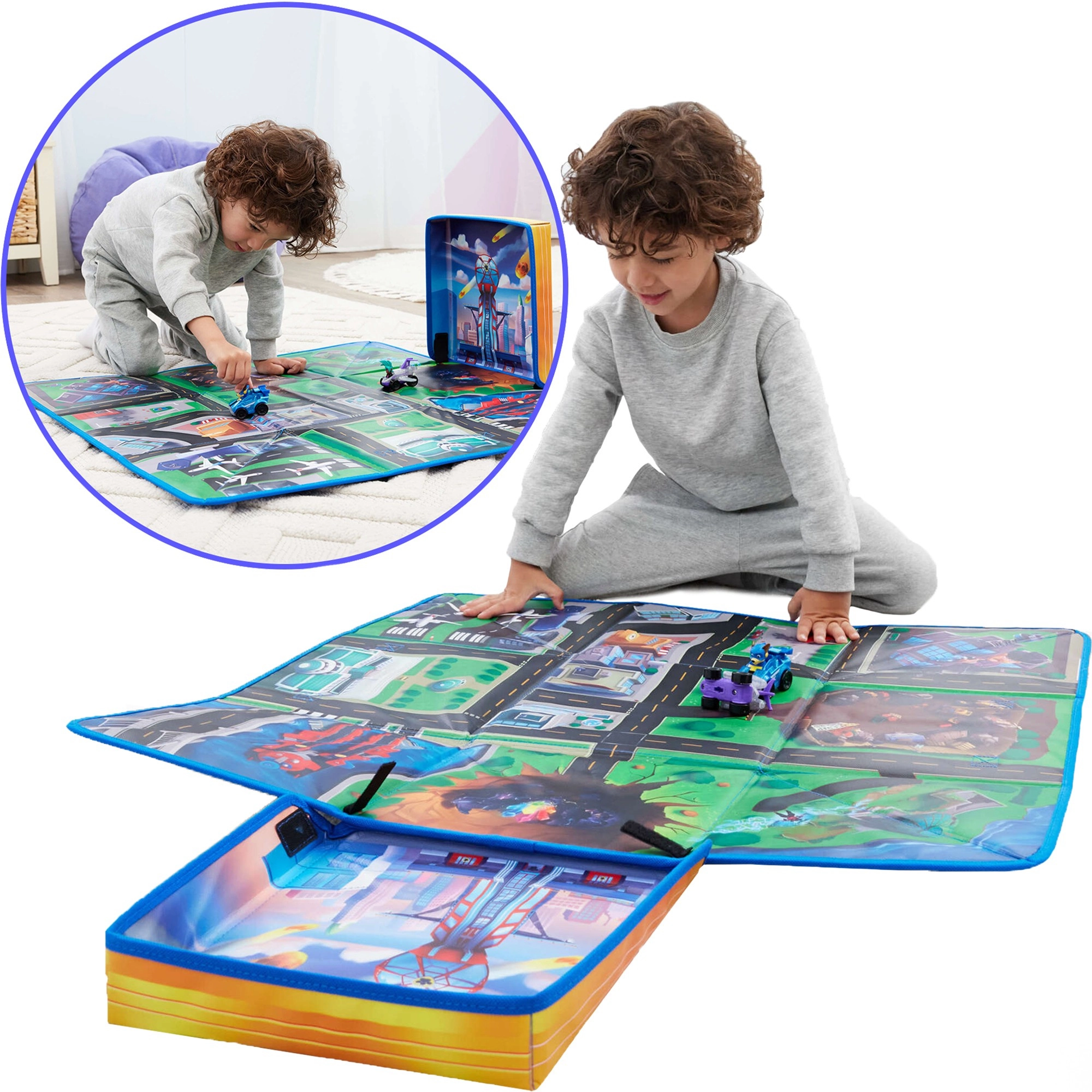 Odkryj sprytne rozwiązanie 2 w 1 dla małych fanów PAW Patrol: kolorową matę do zabawy z motywem miasta i lotniska, którą po skończonej zabawie łatwo złożysz w praktyczne pudełko do przechowywania. Dzieci będą się świetnie bawić, urządzając kreatywne wyścigi samochodzikami, odtwarzając sceny z PAW Patrol: The Mighty Movie, a dzięki kompaktowym wymiarom wszystko szybko trafi na swoje miejsce.