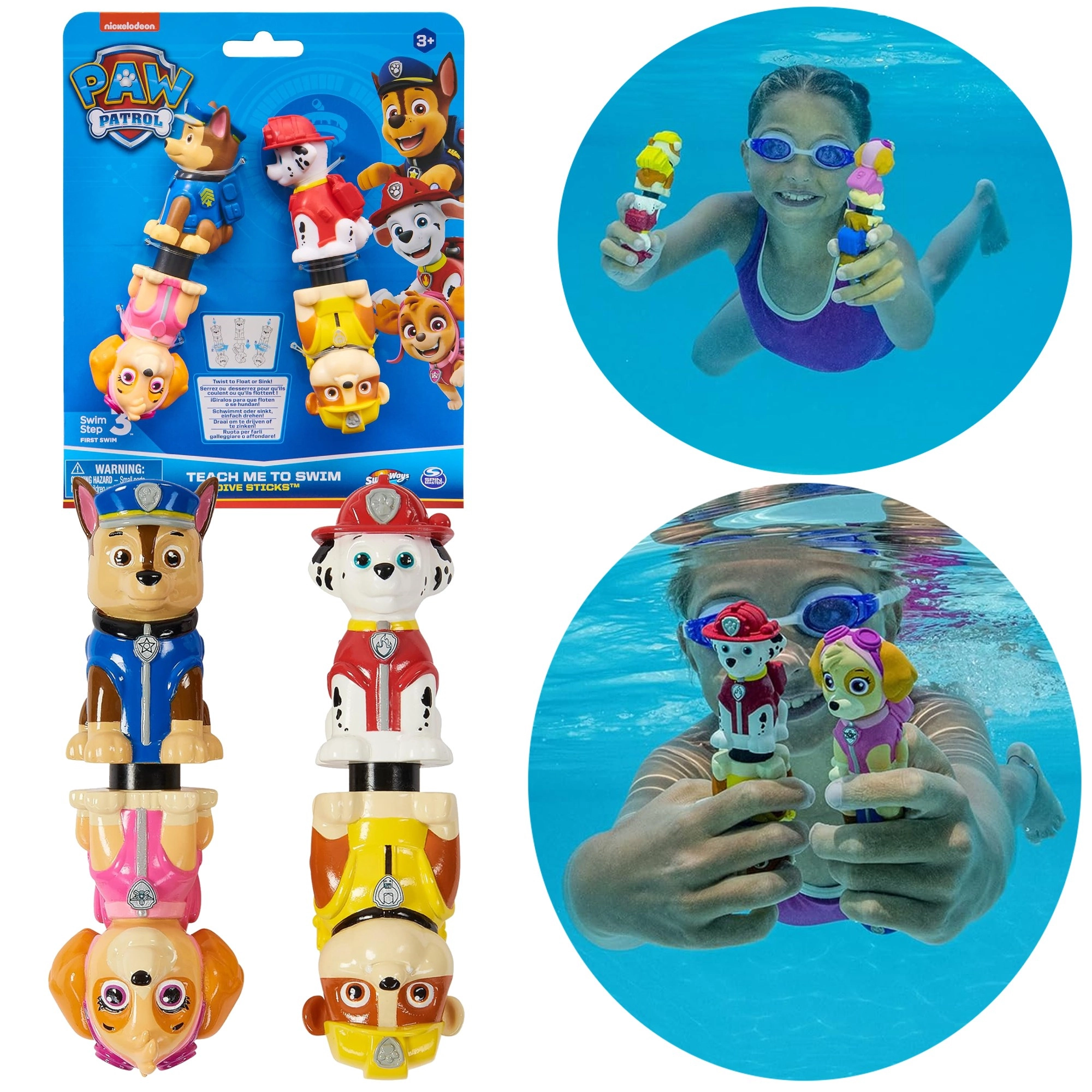 Chase, Skye, Marshall i Rubble w jaskrawych barwach ułatwiają poszukiwanie pod wodą i zwiększają frajdę podczas pływania.