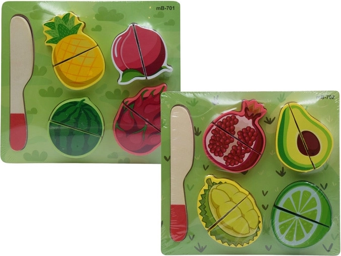 Możesz wybrać spośród dwóch wariantów owoców. Poszczególne elementy mocno się trzymają, a jednocześnie łatwo oddzielają się drewnianym nożykiem, co zapewnia realistyczne wrażenia z „krojenia” bez ryzyka skaleczenia. Świetne do domu, przedszkola i jako prezent.