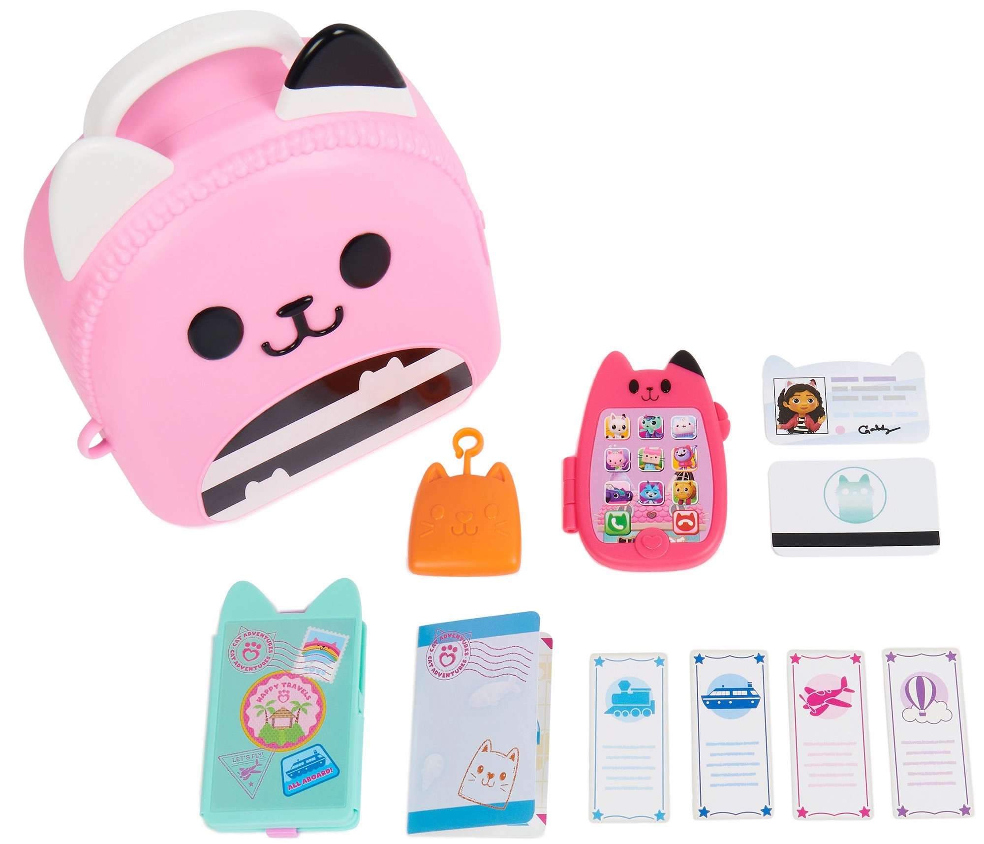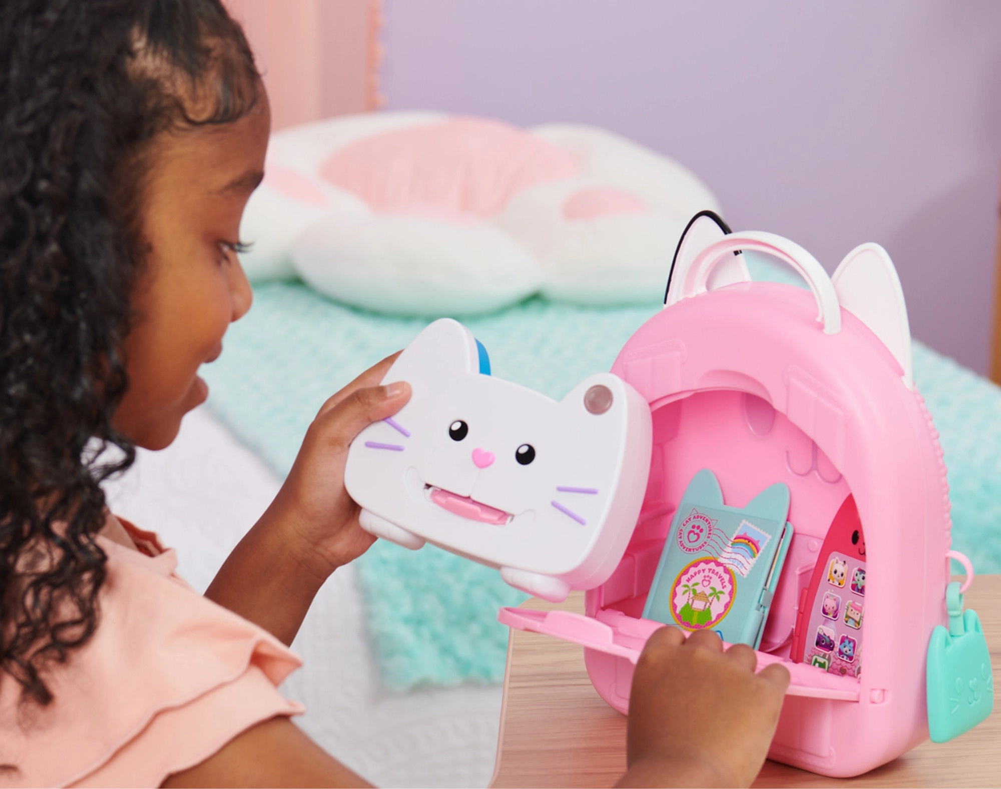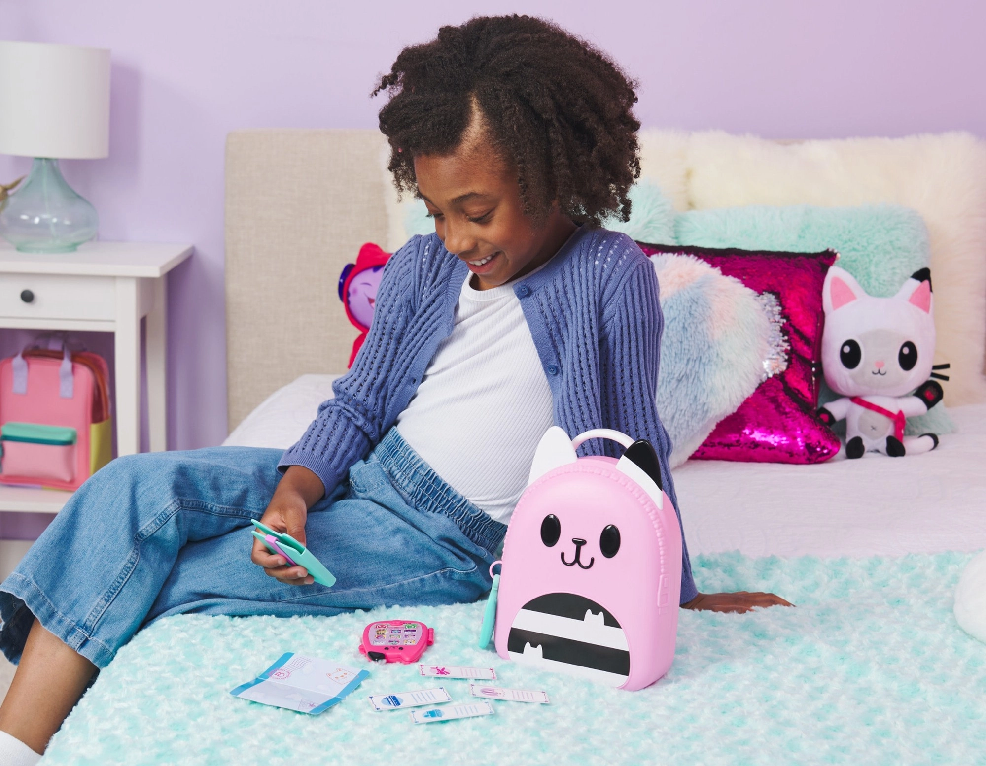 Przenieś dzieci do świata GABBY’S DOLLHOUSE dzięki temu uroczemu zestawowi podróżnemu. Zawiera różowy koci plecaczek, otwierany telefon, portfel oraz dokumenty i bilety do zabawy w podróż. Wszystko jest kompaktowe i przenośne, zaprojektowane do kreatywnej zabawy i łatwego przechowywania wszystkich 11 elementów bezpośrednio w plecaczku.