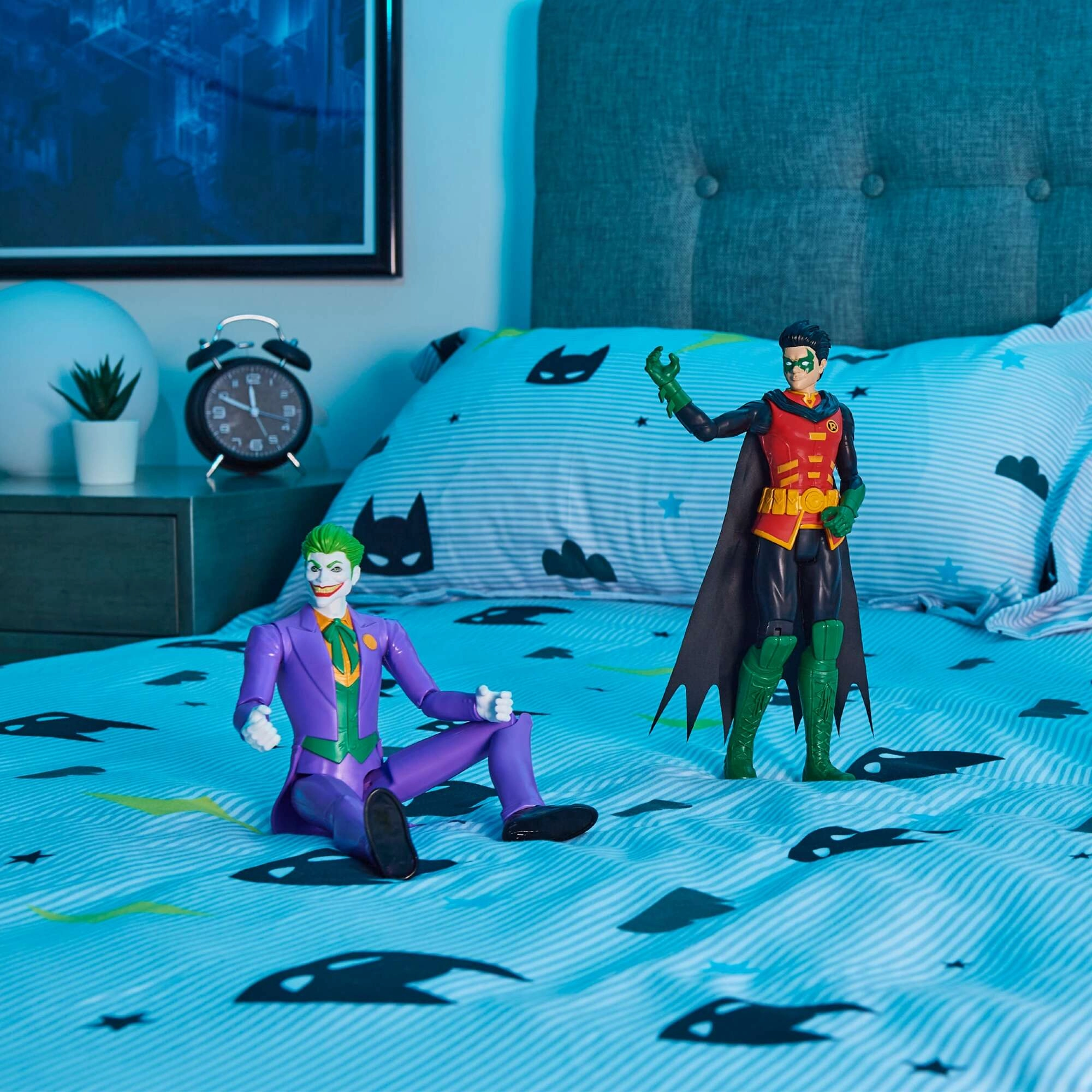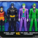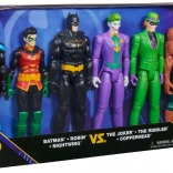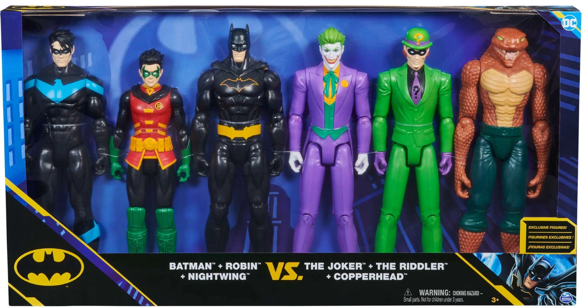 Figurki o ok. 28 cm wysokości są stworzone tak, by wytrzymać codzienną zabawę, a jednocześnie świetnie prezentować się na półce. Zestaw zawiera: Batmana w czarno–żółtym stroju z peleryną, Robina z maską, Nightwinga w czerni z niebieskimi elementami, Jokera w ikonicznym fioletowym garniturze, Człowieka Zagadkę w zielonym stroju ze „?” oraz Copperheada z ogonem.