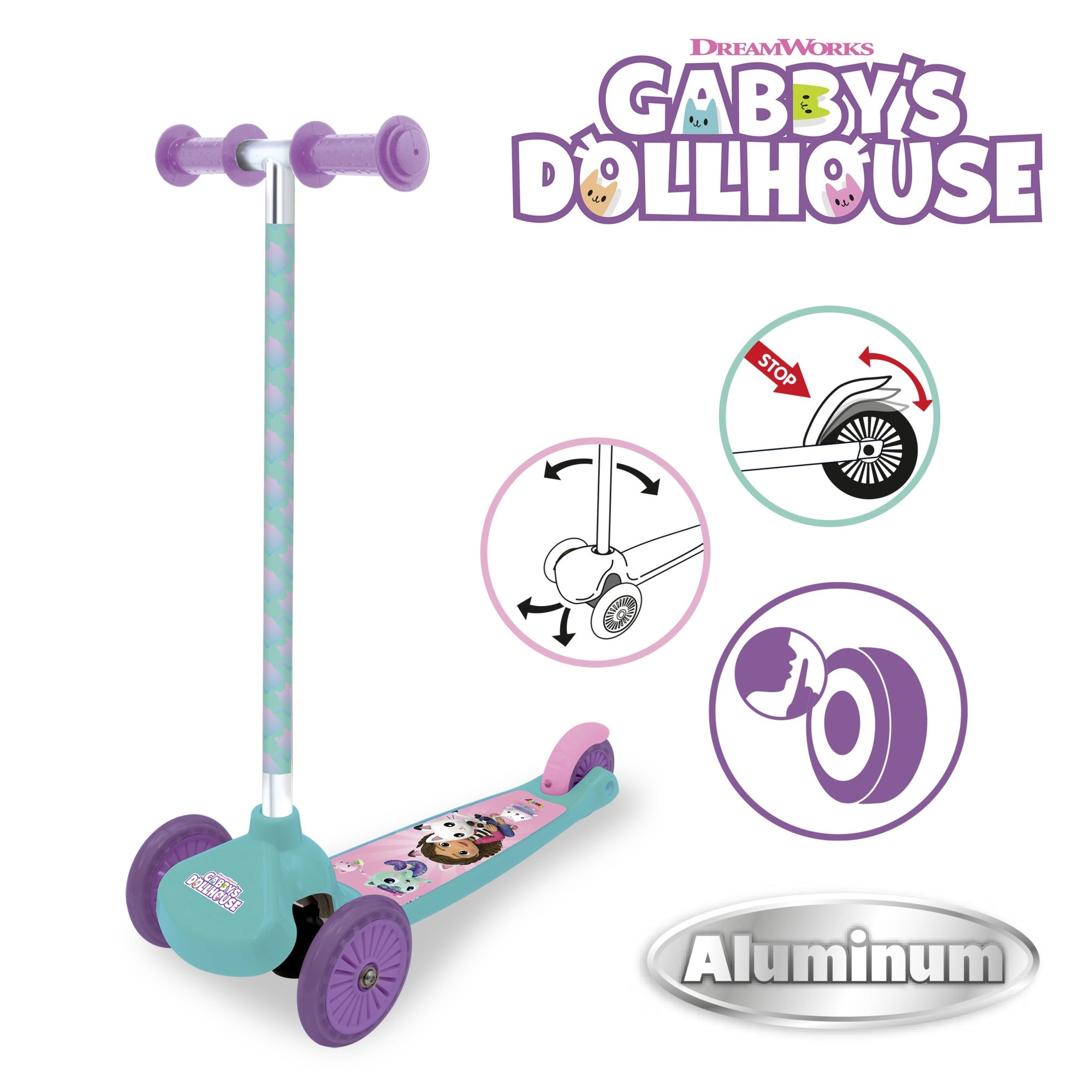 Stylowa hulajnoga w turkusowo‑fioletowym wydaniu z grafiką ulubionych kocich bohaterów zachwyci wszystkich fanów serialu Koci domek GABI. Wysoka jakość marki SMOBY zapewnia niską wagę, wytrzymałość i komfort podczas każdej przejażdżki. Dzięki dwóm przednim kołom jazda jest stabilna i intuicyjna, więc dzieci łatwo nauczą się trzymać równowagę i balans.