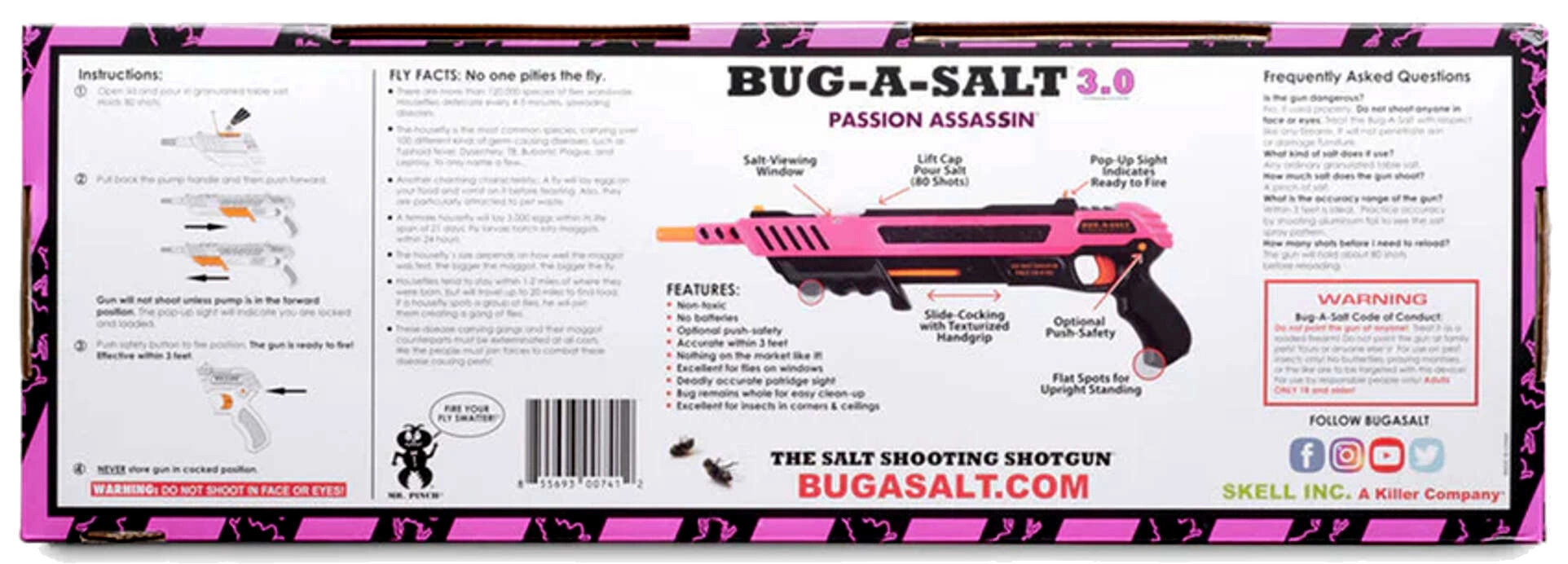 BUG-A-SALT 3.0 Pink Passion Assassin to unowocześniona wersja popularnej „solnej strzelby” dla dorosłych, która eliminuje owady krótkim wystrzałem soli kuchennej. Dzięki mechanicznemu napędowi bez baterii zawsze jest gotowa do działania, a przy prawidłowym użyciu nie uszkadza powierzchni, takich jak okna czy siatki. Różowo‑czarny design z pomarańczowymi akcentami doda Twoim „łowom na muchy” stylu.