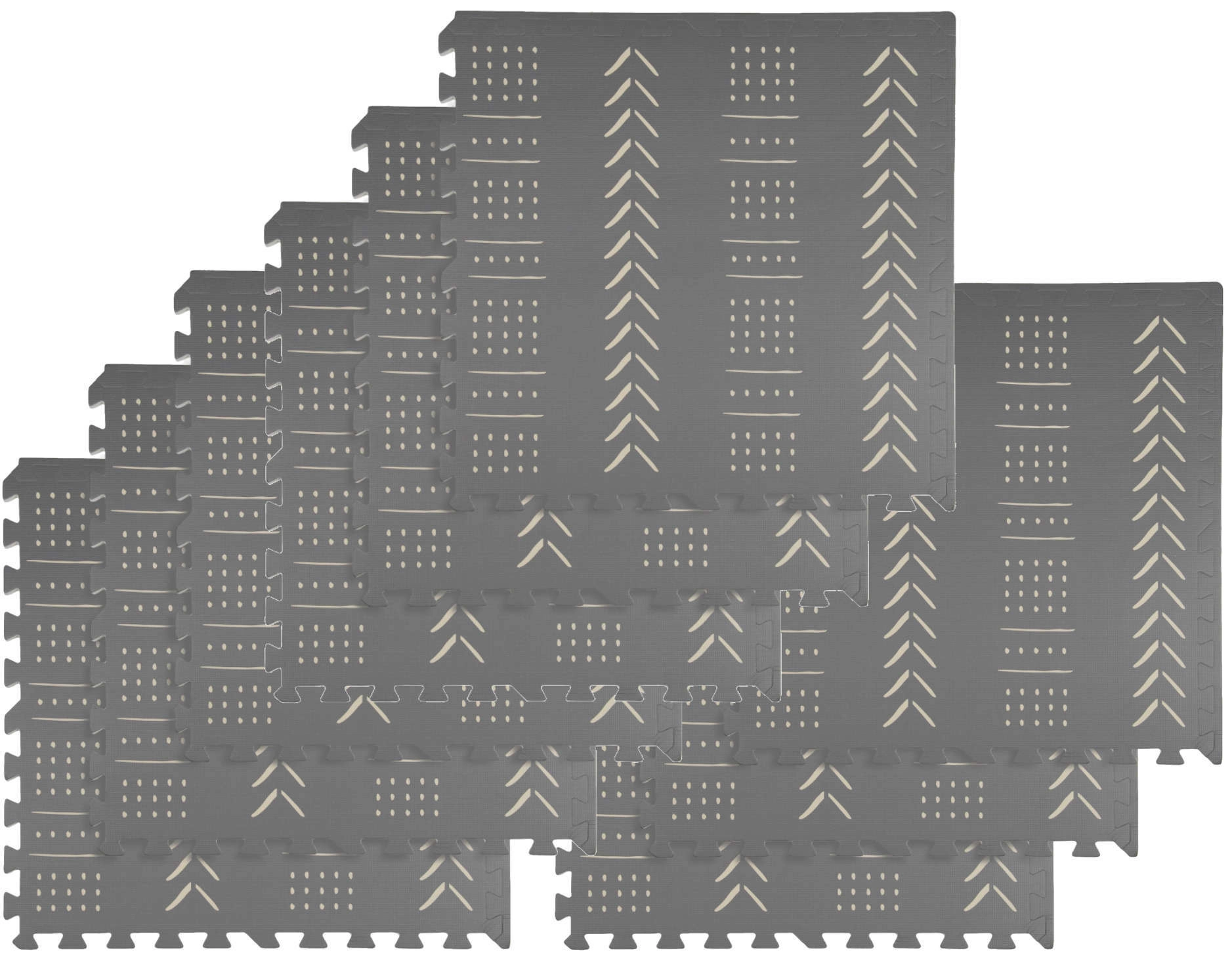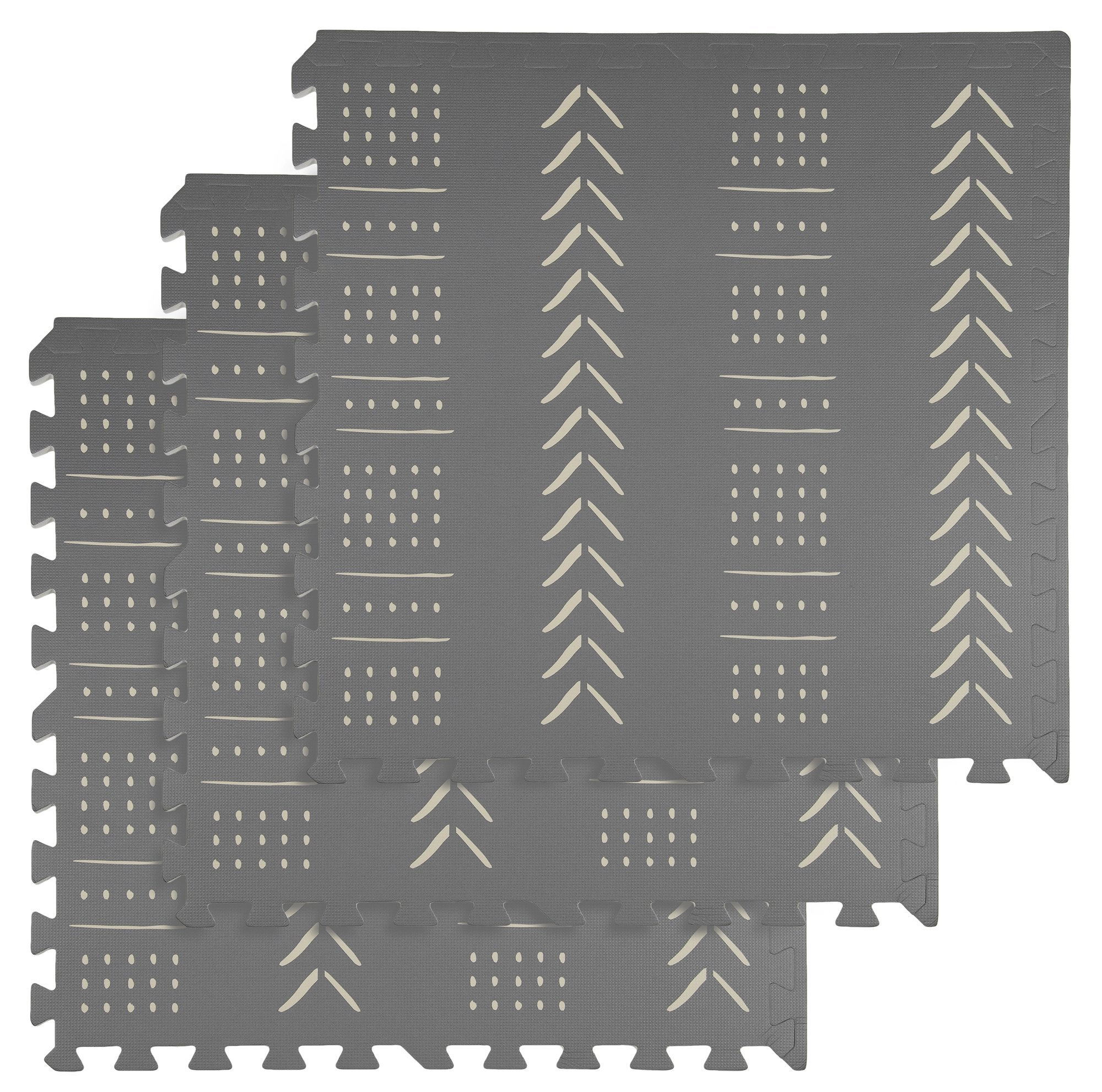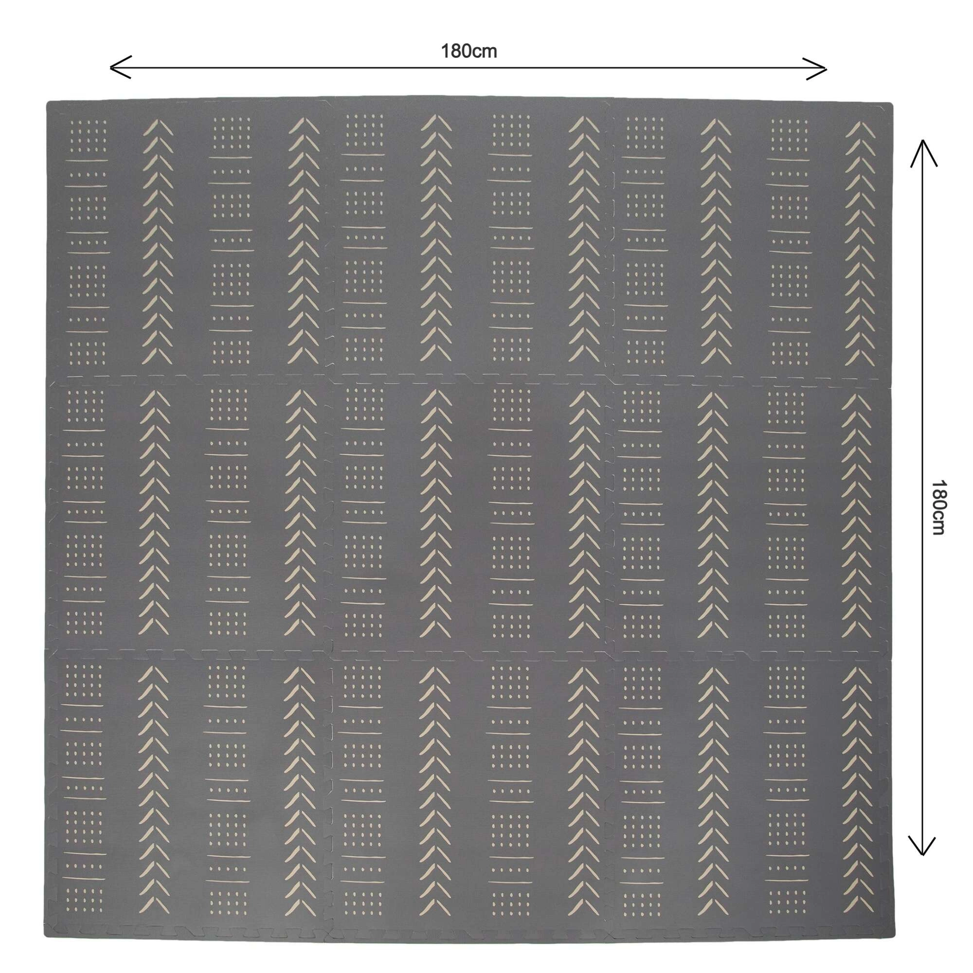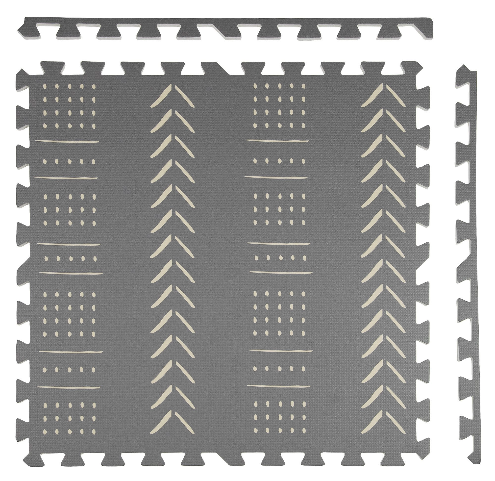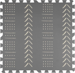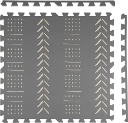 Piankowa mata puzzlowa Humbi w eleganckim szarym kolorze z geometrycznym wzorem tworzy miękką, bezpieczną i cichą przestrzeń do zabawy, pełzania i relaksu. Elementy składają się jak puzzle, dzięki czemu łatwo dopasujesz rozmiar i kształt. Mata chroni przed chłodem podłogi, pochłania uderzenia i hałas, a dzięki wodoodpornej powierzchni łatwo utrzymasz ją w czystości.