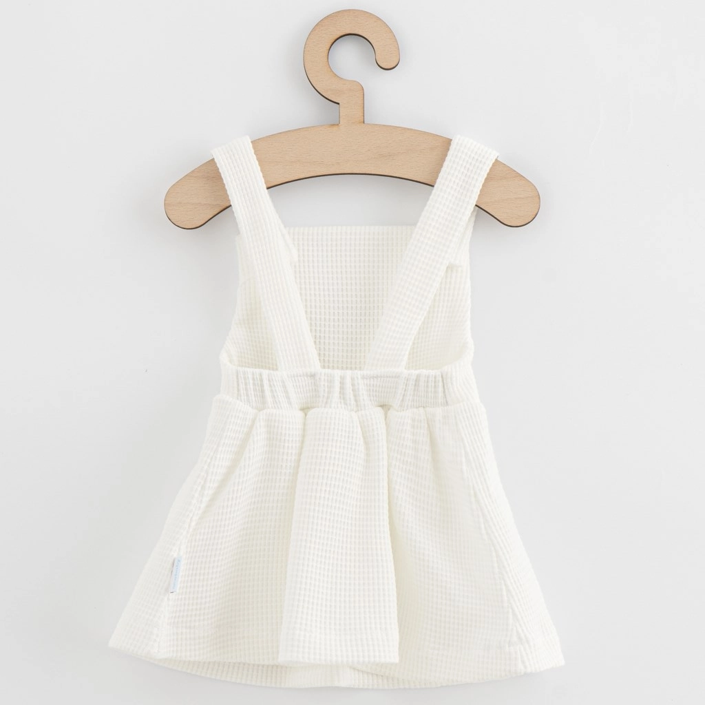 Dzięki wygodnemu krojowi z górą typu ogrodniczki i zapięciu na guziki sukienkę łatwo się zakłada i dobrze trzyma na miejscu. Świetnie łączy się z koszulką lub body oraz rajstopami, sprawdzi się przez cały rok – od codziennych dni po wizyty i przyjęcia.