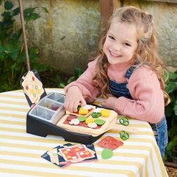 Ten nowoczesny zestaw do pizzy dla dzieci oferuje realistyczne przygotowanie pizzy krok po kroku. Dzięki przejrzystym przegródkom na składniki dzieci z łatwością wybierają to, co trafi na pizzę, a według dołączonych przepisów lub własnej fantazji skomponują idealne połączenia. Odłączane elementy łatwo mocuje się do korpusu i zdejmuje, dzięki czemu można bawić się w kółko.