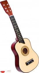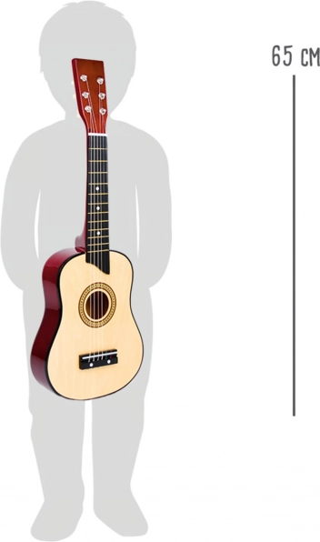 Ta naturalna drewniana gitara to świetny wybór dla małych muzyków. Dzięki nylonowym strunom jest przyjemna w dotyku i wyrozumiała dla dziecięcych początków. Otrzymasz wszystko, czego potrzeba do pierwszych dźwięków – kostkę i zapasową strunę.