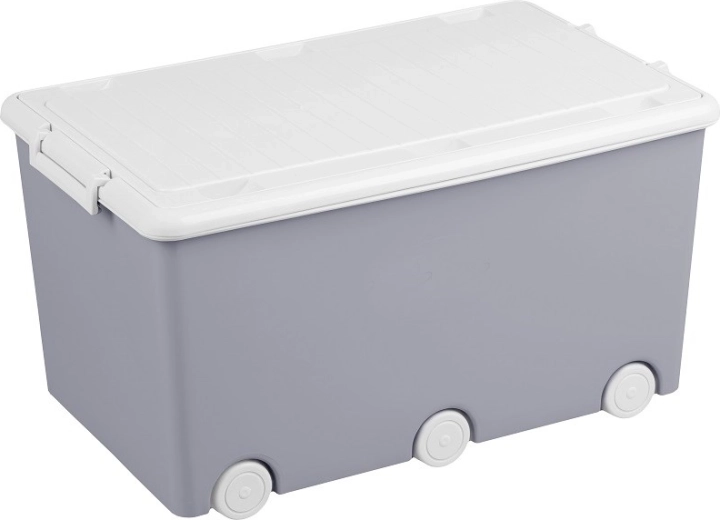 Praktyczne i wytrzymałe pudełko na zabawki TEGA pomaga utrzymać porządek w pokoju dziecka każdego dnia. Dzięki dużej pojemności 60 litrów pomieści zabawki, książki i drobiazgi, a 6 kółek zapewnia płynne i ciche przesuwanie po pomieszczeniu. Boczne zamknięcie na 2 napy trzyma zawartość bezpiecznie w środku, a szary kolor pasuje do każdego wystroju.
