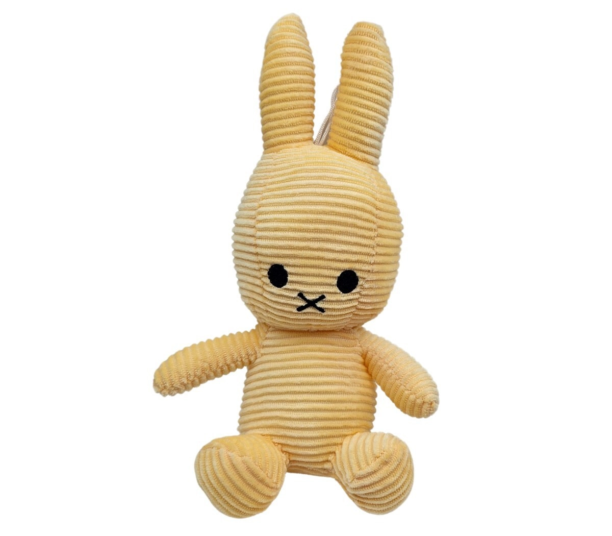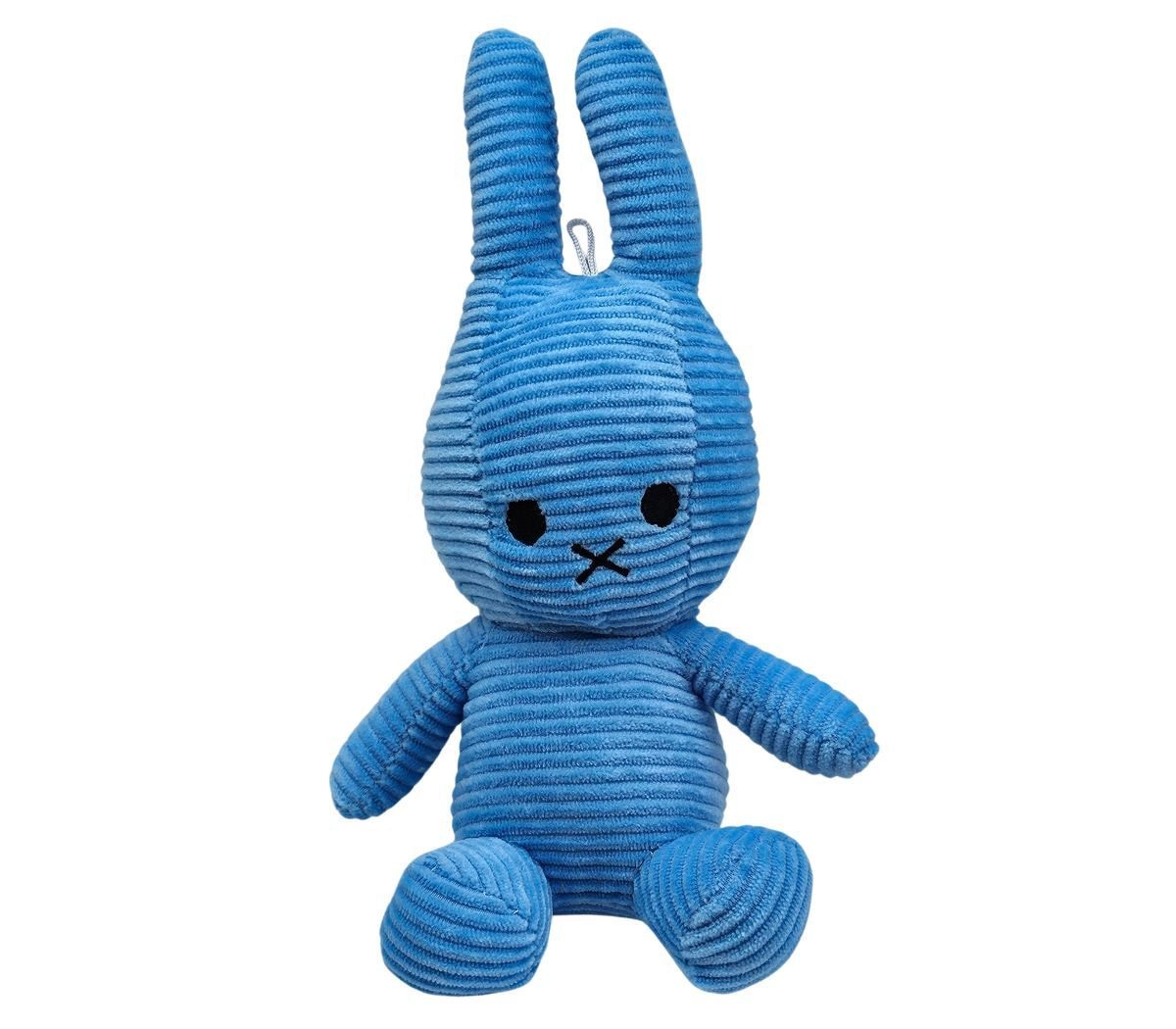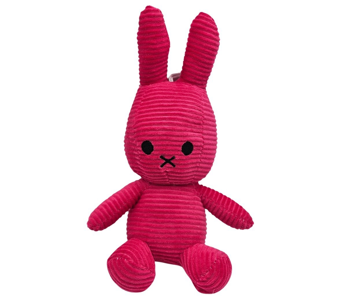 Króliczek jest z miękkiej prążkowanej tkaniny, która jest przyjemna w dotyku i zachęca do przytulania oraz sensorycznego odkrywania.