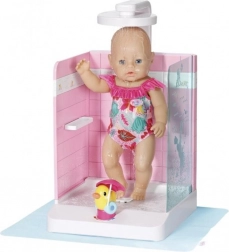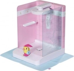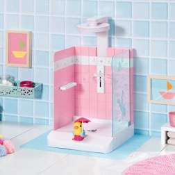 Praktyczny uchwyt na lalkę bezpiecznie utrzyma bobaska BABY born i starsze rodzeństwo na miejscu, a regulowana wysokość prysznica dostosuje się do obu rozmiarów. W zestawie znajduje się także mata przeciw rozchlapywaniu wody, która utrzymuje otoczenie w suchości. Elegancki design z różowymi kafelkami doskonale pasuje do dodatków z kolekcji Łazienka.