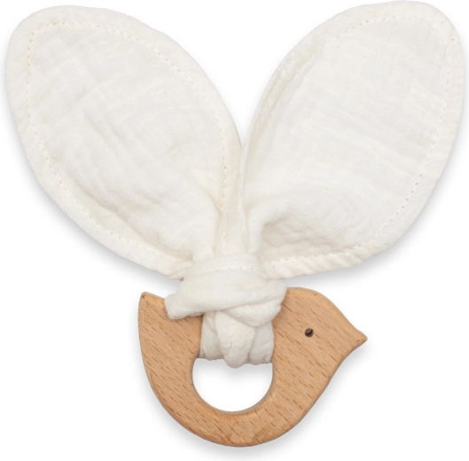 Dziecięcy gryzak NEW BABY Bird white łączy naturalne drewno bukowe i delikatną tkaninę muślinową ze 100% organicznej bawełny. Twardsza, drewniana część pomaga masować dziąsła i łagodzić napięcie, natomiast miękki muślin zapewnia przyjemny w dotyku materiał i możliwość delikatnego wytarcia śliny.