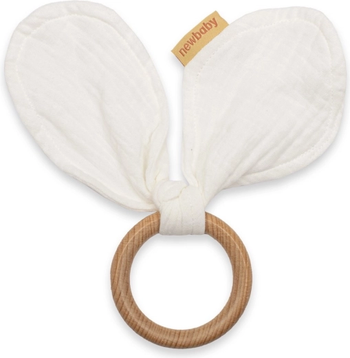 Gryzak New Baby Ears w białym kolorze został zaprojektowany z myślą o komforcie i ukojeniu dziąseł podczas wyrzynania się pierwszych ząbków. Bukowy drewniany pierścień jest gładki i wytrzymały, a miękki muślin zapewnia przyjemny dotyk oraz możliwość delikatnego wytarcia śliny czy zabawy.