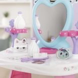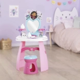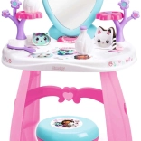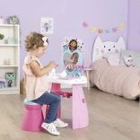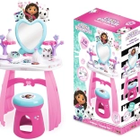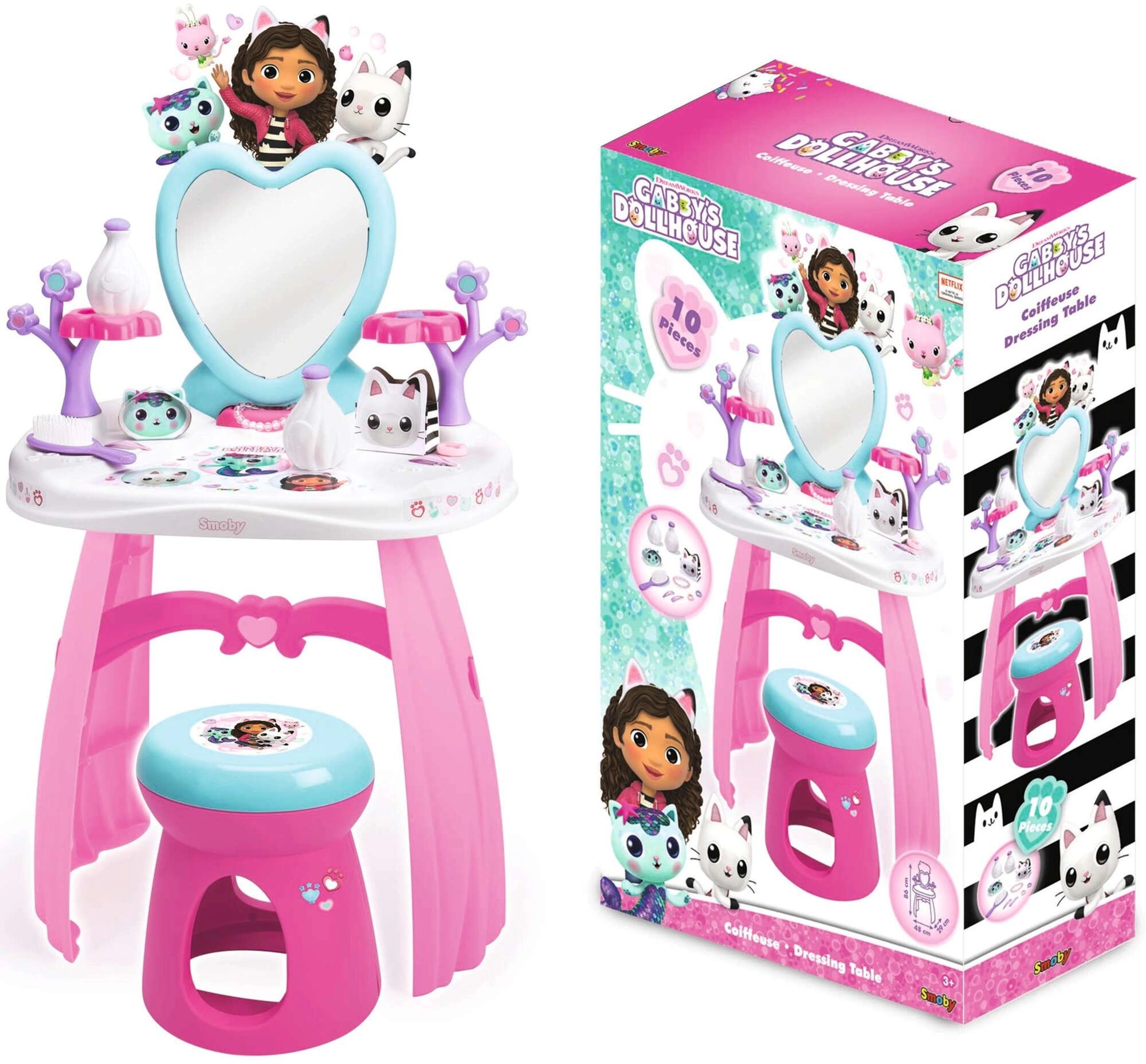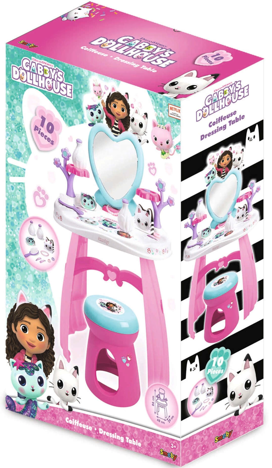 Stwórz w domu własny salon piękności z toaletką inspirowaną serialem GABBY’S DOLLHOUSE. Pastelowe różowo‑fioletowe barwy, serduszkowe lustro i urocze kocie dekoracje pobudzają wyobraźnię i wspierają kreatywną zabawę w odgrywanie ról. Lekka, a zarazem stabilna konstrukcja oraz zaokrąglone krawędzie są idealne dla dzieci od 3 lat.
